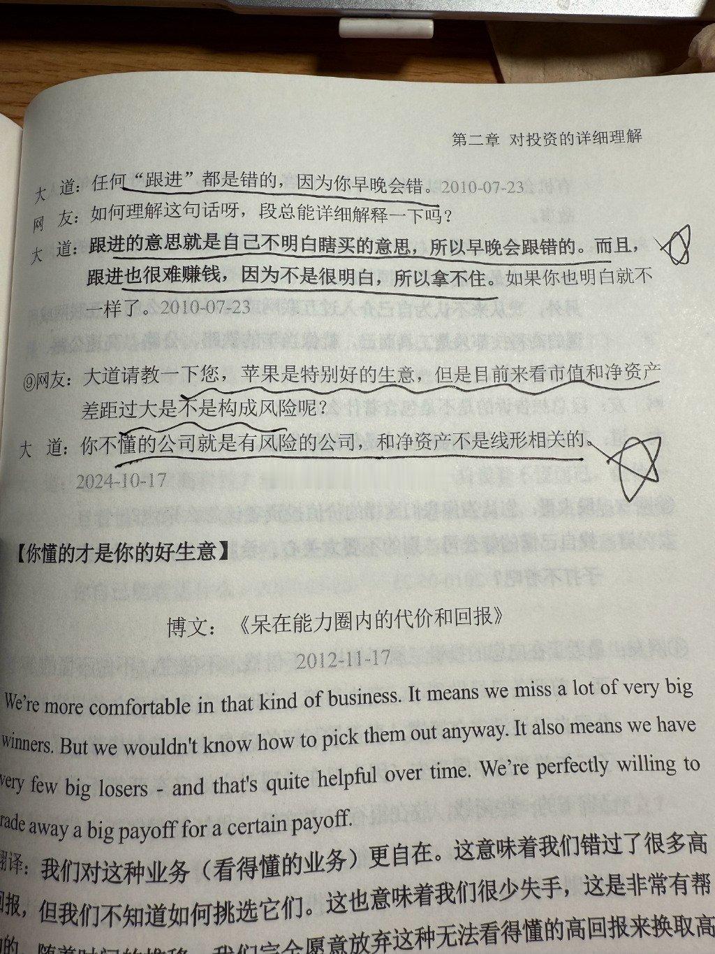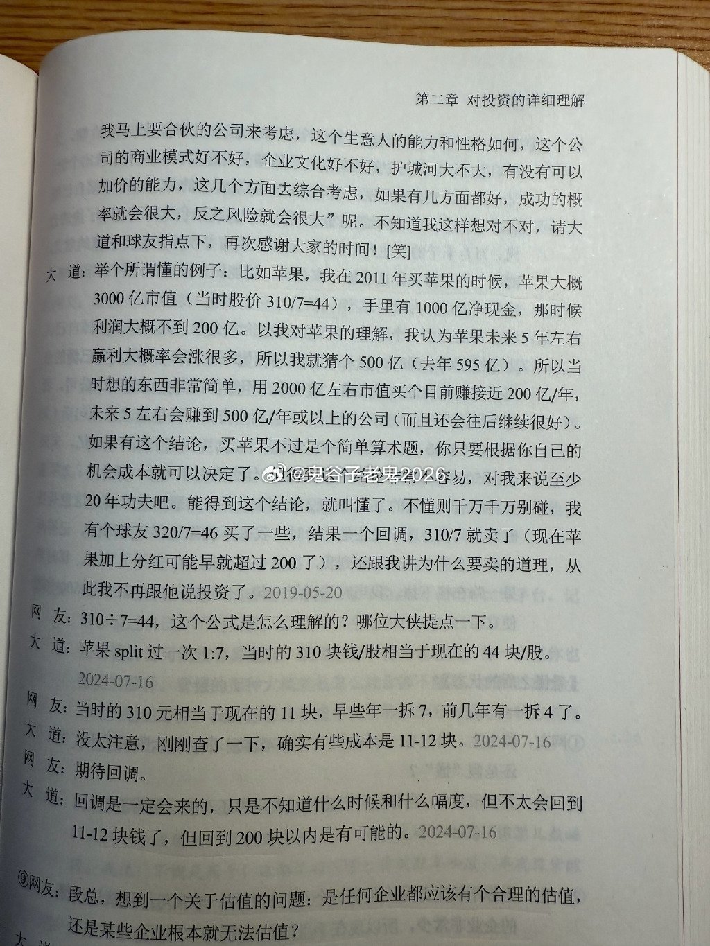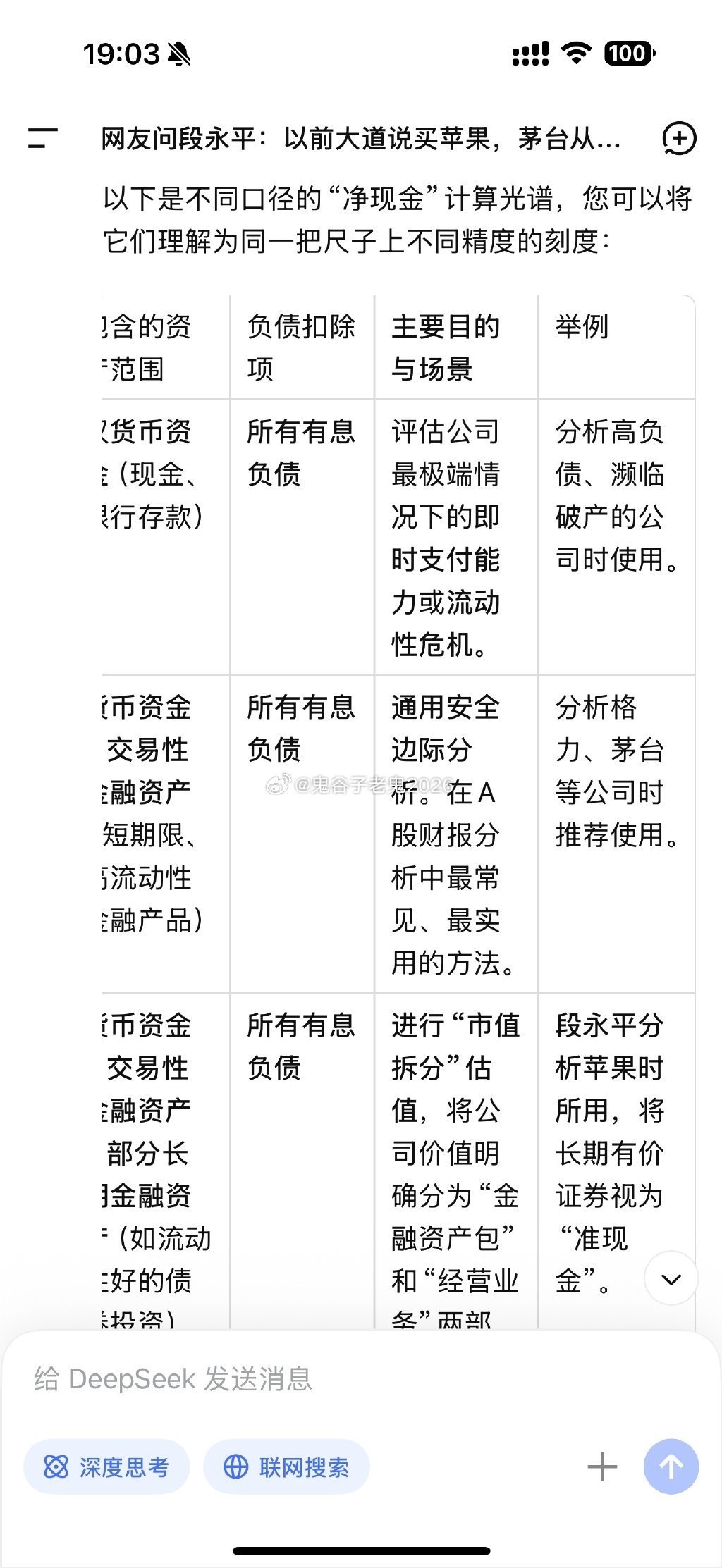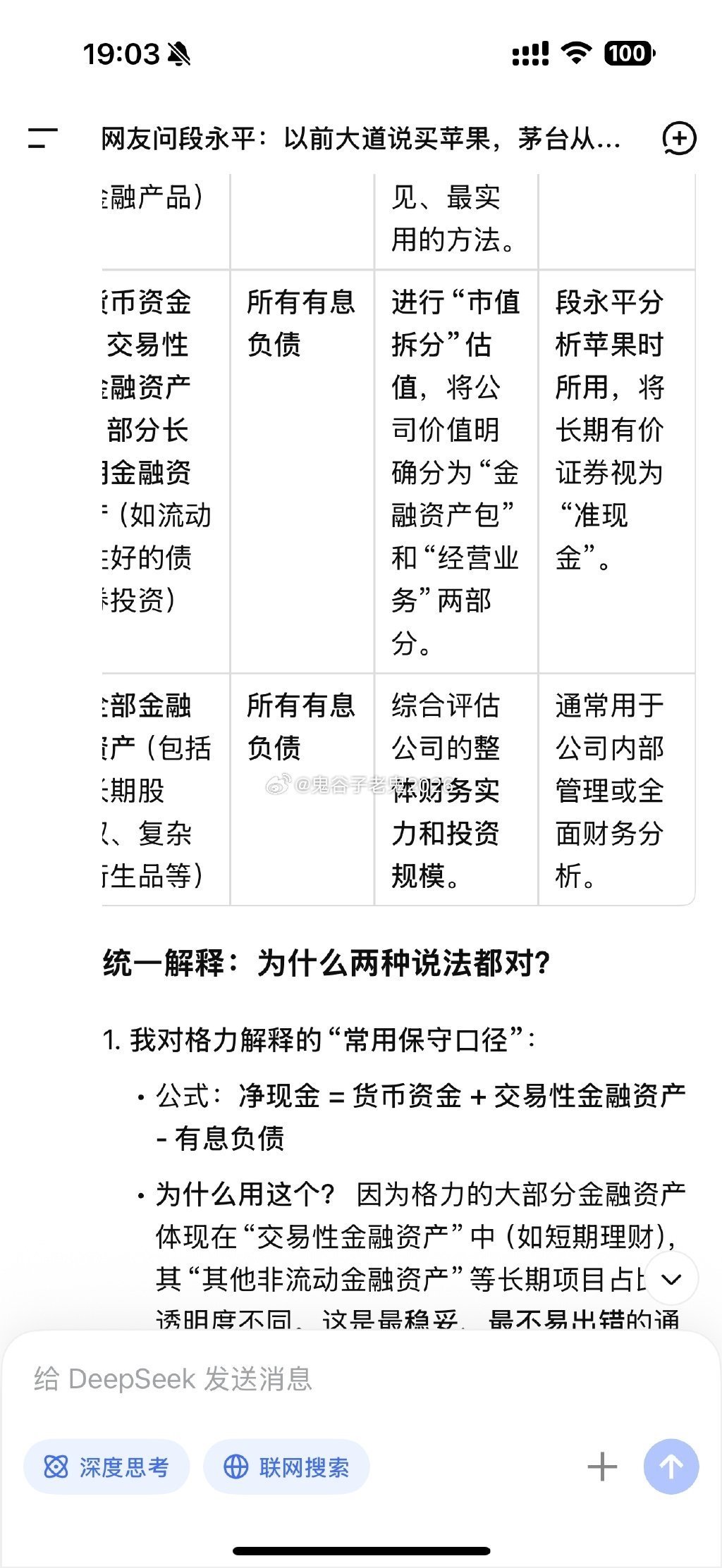 段永平:举个所谓懂的例子:比如苹果,我在2011年买苹果的时候,苹果大概3000亿市值(当时股价310/7=44),手里有1000亿净现金,那时候利润大概不到200亿。以我对苹果的理解,我认为苹果未来5年左右赢利大概率会涨很多,所以我就猜个500亿(去年595亿)。所以当时想的东西非常简单,用2000亿左右市值买个目前赚接近200亿/年,未来5左右会赚到500亿/年或以上的公司(而且还会往后继续很好)。如果有这个结论,买苹果不过是个简单算术题,你只要根据你自己的机会成本就可以决定了。但得到这个结论非常不容易,对我来说至少20年功夫吧。能得到这个结论,就叫懂了。不懂则千万千万别碰,我有个球友320/7=46买了一些,结果一个回调,310/7就卖了(现在苹果加上分红可能早就超过200了),还跟我讲为什么要卖的道理,从此我不再跟他说投资了。2019-05-20段永平说的,手里有1000亿净现金,这个净现金的计算方法是什么?根据段永平的描述和投资逻辑,他所说的“手里有1000亿净现金”指的是苹果公司在2011年那个时点,其财务报表上“现金及等价物”减去“有息负债”后的净额。这是一种典型的保守估值方法,用于衡量公司最确定、最底层的资产价值。净现金的计算方法其核心公式为:净现金 = 现金及现金等价物 + 短期有价证券 - 有息负债具体到苹果2011年的情况(基于其2011财年年报,截至2011年9月24日),计算如下:1. 现金及等价物:这是公司流动性最强的资产。 · 现金及现金等价物:259亿美金 · 短期有价证券:161亿美金(通常是期限在1年以内的高流动性债券等)2. 长期有价证券:557亿美金(期限超过1年的债券等)。段永平在评估时,通常会将这部分也视为“准现金”,因为可以相对容易地变现。3. 有息负债:在2011年,苹果公司几乎没有有息负债。它是在2013年后才开始大规模发行债券用于避税和分红回购。因此,当时的有息负债可视为0。因此,一个保守的估算可以是:净现金 ≈ 现金及等价物 + 全部有价证券= 259亿(现金及等价物) + 161亿(短期有价证券)+ 557亿(长期有价证券)= 977亿美金这个数字非常接近段永平所说的“1000亿净现金”。他采用了将长期有价证券也计算在内的、更为宽泛和保守的口径。段永平如何运用这个数字进行估值决策这是他投资思维的关键。他没有直接用3000亿的总市值去思考,而是进行了 “价值拆分”:1. 拆解市值:苹果总市值约3000亿美金。2. 剥离净现金:其中包含约1000亿净现金。这意味着,他为苹果的 “经营业务” 实际支付的价格是:3000亿 - 1000亿 = 2000亿美金。3. 评估经营业务:当时苹果的经营业务(iPhone、Mac等)一年能创造约200亿美金的利润。他用2000亿美金市值,买入了一个年赚200亿、且他判断未来几年利润会快速增长到500亿的业务。4. 结论:这相当于为当前盈利支付了约10倍市盈率(2000亿/200亿),而未来盈利的预期市盈率则会降至4倍(2000亿/500亿)。这是一个在他看来确定性很高、赔率很好的“简单算术题”。给您的核心要点1. 计算口径:在效仿此法时,您可以根据自己的保守程度,选择是否将长期有价证券计入“净现金”。更保守的口径是只计算“现金及等价物+短期有价证券”。2. 关键作用:计算净现金的核心目的,是为了进行价值拆分,从而更清晰地看出你为公司的“经营业务”(即真正的赚钱机器)支付了多少溢价,并评估其安全边际。3. 段氏精髓:这个计算本身是简单的,但正如段永平所说,难的是得出“苹果未来利润大概率会涨到500亿”这个结论。这才是“懂了”的真谛,需要多年的商业洞察力积累。总结:段永平所说的净现金,是一个经过调整的、宽泛的“现金及可变现金融资产”概念。它最重要的作用不是得出一个精确数字,而是作为一种思维工具,将市值拆分,帮助投资者聚焦于“经营业务”的价值与价格,从而做出理性决策。黄乾隆:你上面不是说,净现金=货币资金+交易性金融资产-有息负债吗?怎么又变了?(答案在下图)