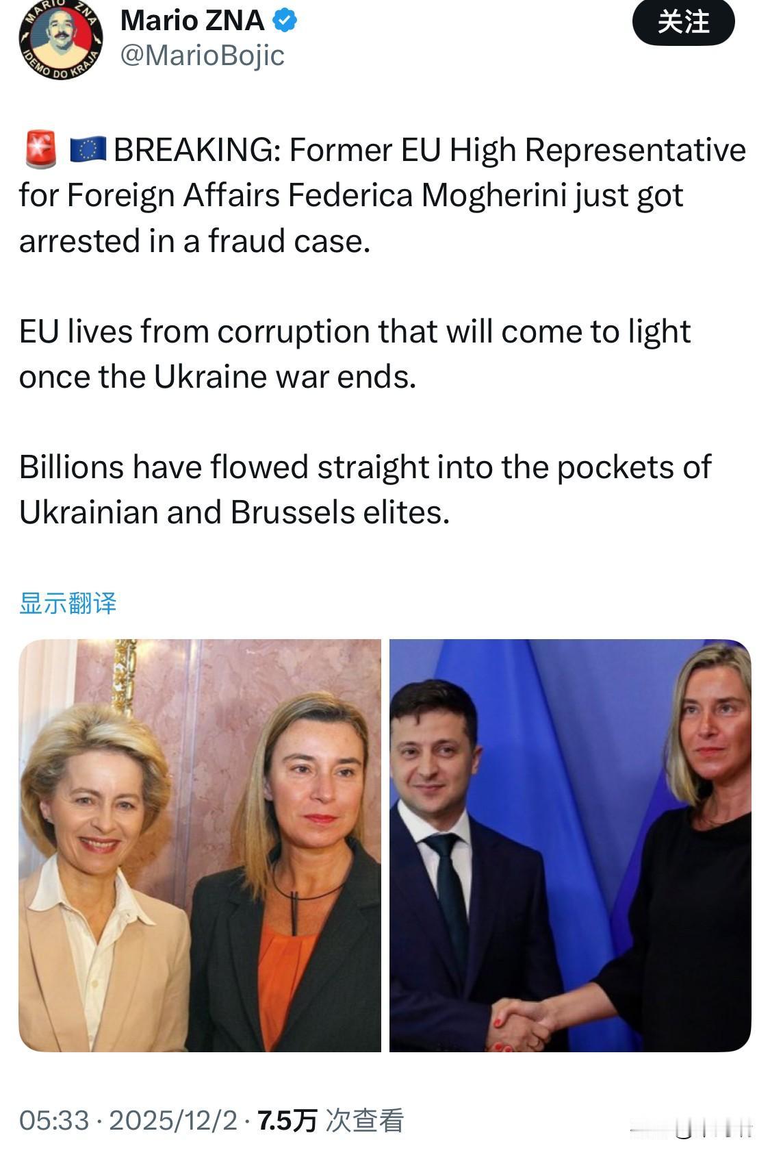 突发新闻:欧盟前外交事务高级代表费代丽卡·莫盖里尼因涉嫌欺诈被捕。 欧盟的生存依赖于腐败,而一旦乌克兰战争结束,这些腐败就会暴露出来。 数十亿美元直接流入了乌克兰和布鲁塞尔精英们的口袋。 前欧盟外交事务高级代表费代丽卡·莫盖里尼(Federica Mogherini)因涉嫌欺诈而被拘留,目前正在接受调查。 莫盖里尼是12月2日在比利时警方的突袭行动中被拘留的三人之一。 此案由欧洲检察官办公室(EPPO)应请求启动,主要针对一项欧盟资助的初级外交官培训项目(名为“欧盟外交学院”)中涉嫌的欺诈和腐败行为。 比利时警方搜查了位于布鲁塞尔的欧盟对外行动署(EEAS)总部、位于布鲁日的欧洲学院(College of Europe)以及几处私人住宅。 另一名被拘留者是欧盟高级官员斯特凡诺·萨尼诺(Stefano Sannino),他曾在2021年至2024年间担任欧盟对外行动署秘书长。 欺诈指控详情 调查的核心是欧洲学院在竞标并赢得欧盟“欧盟外交学院”培训项目合同的过程中,是否存在不当行为。该项目价值约65万欧元(另有报道称涉及320万欧元购买建筑)。 调查人员怀疑,欧洲学院及其代表可能提前得知了本应保密的招标信息,从而影响了竞标的公平性。 最新进展 莫盖里尼曾在2014年至2019年担任欧盟外交与安全政策高级代表,现任欧洲学院院长。 在采取拘留行动前,相关人员的外交豁免权已被取消。 目前,没有人被正式起诉,比利时法官有48小时的时间决定是否采取进一步行动(如继续拘留或释放)。 这起针对欧盟高级机构和前高级官员的调查对比利时政界和欧盟机构产生了巨大震动。