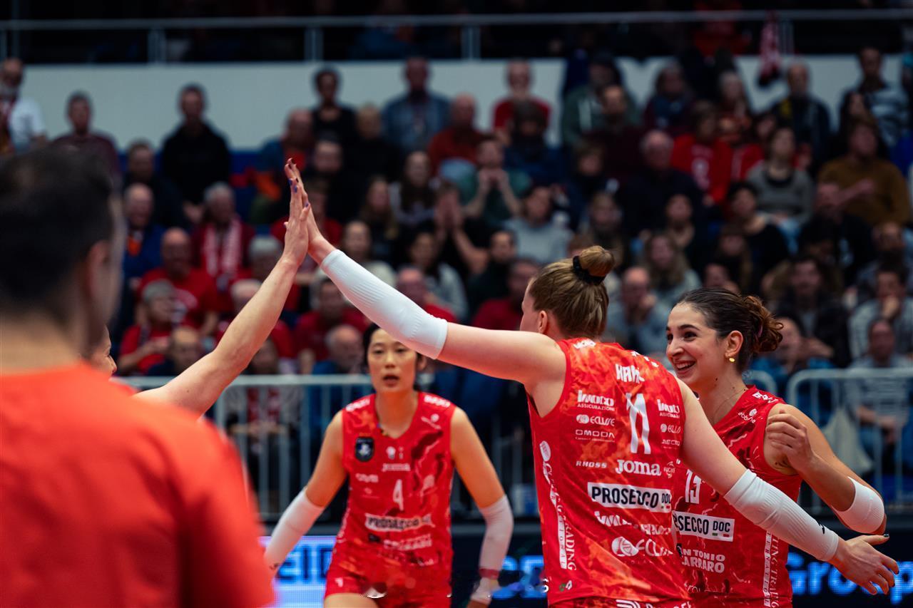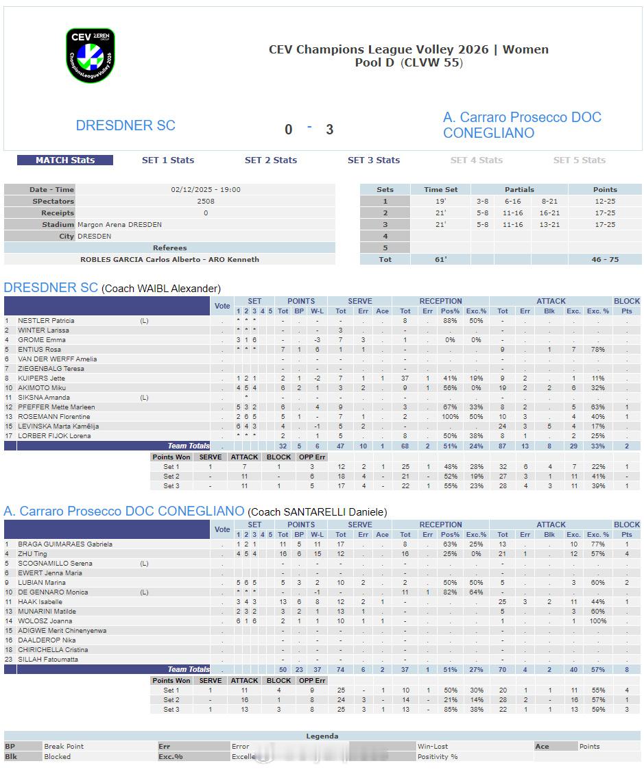 【欧冠女排科内3-0横扫德累斯顿取23连胜 MVP朱婷16分冠全场】中国排球留洋动态 12月2日德国德累斯顿,欧冠女排第四轮第二回合,D组意大利科内利亚诺客场3-0(25-12/25-17/25-17)横扫德国德累斯顿,取得欧冠23连胜。朱婷得到全场最高的16分(21扣12中4拦)、哈克13分、加比11分,恩迪乌斯得到主队最高的7分。