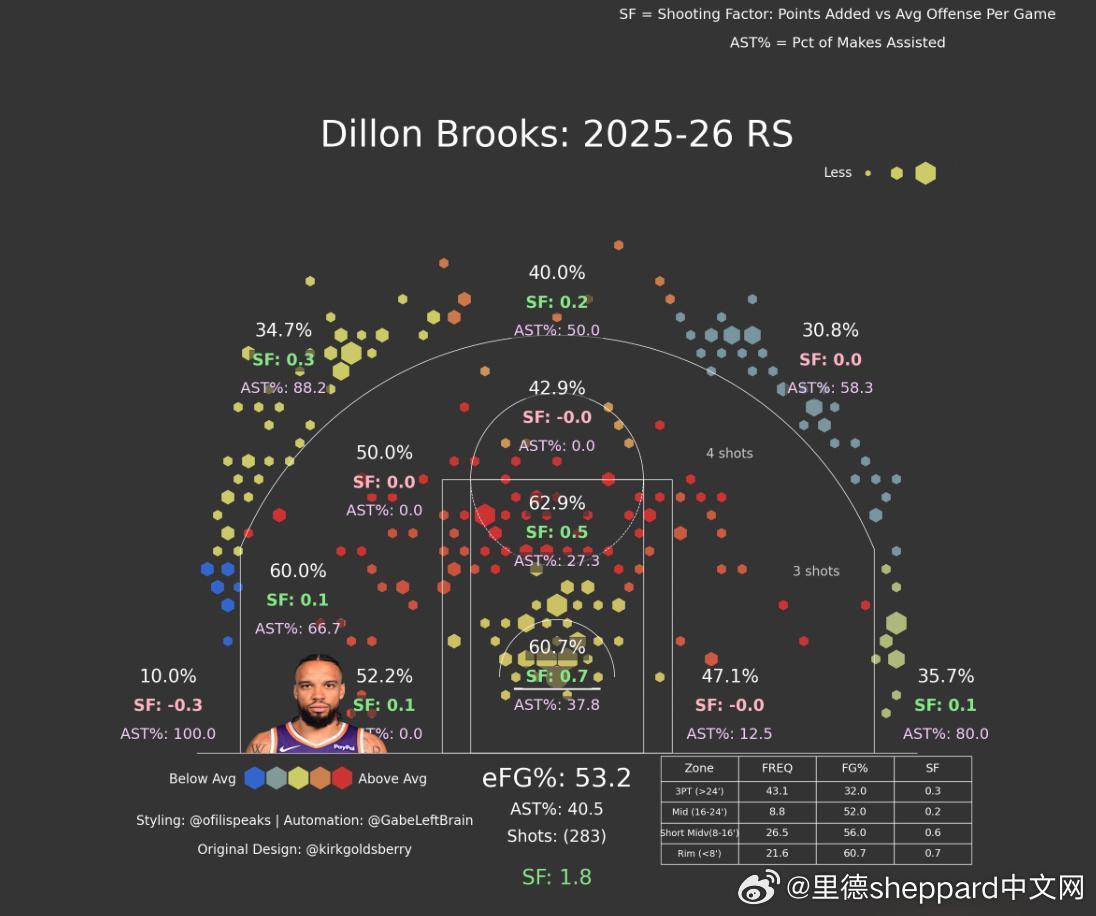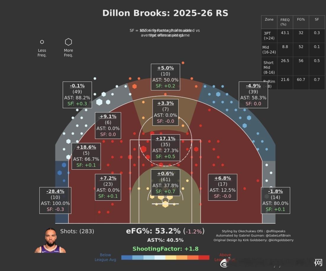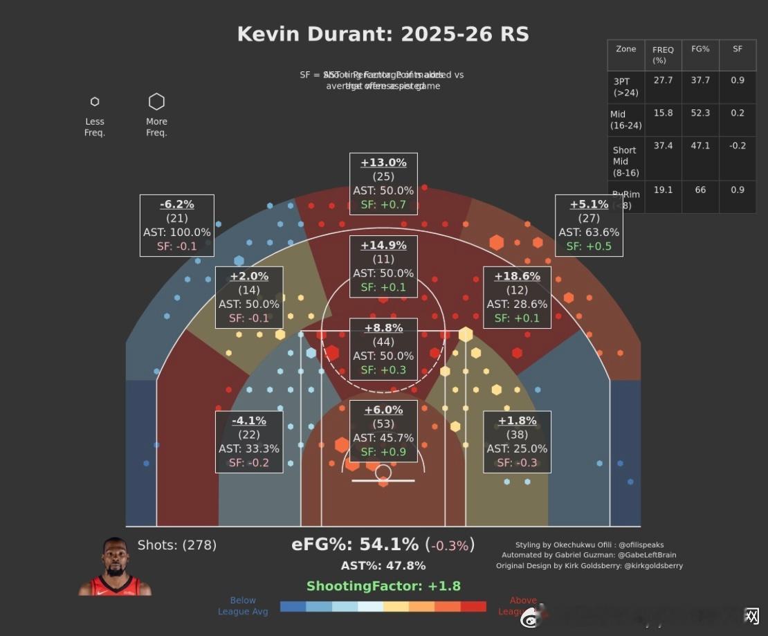 满足要求,来对比下这赛季狄龙和kd的投篮对比图1和图2 是基础热图,图3,图4是和平均水准的差异化对比图,狄龙的受助攻率低,基本都是大量个人持球进攻…三分线内效率比kd整体好,但外线远不如kd…kd外线投的少很多… 狄龙外线出手偏多kd很喜欢油漆区外侧一带的扇形范围中投,这一区域不如狄龙的命中率狄龙三分线内的进攻各个点全方位超过联盟平均水准….(之前我发过一个上赛季fvv和狄龙的图… 就是说这两个中距离的投射每回合得分能在联盟排到前50行列….)只单纯看下投射热图对比两个球员处于不同的球队体系,太阳偏向于后场驱动的开放进攻体系,火箭更多的用kd来锋线单打…不要过多去讨论交易的问题!!太阳本赛季战绩能在西部前8,狄龙确实作用很大…(我本来预期太阳在附加赛边缘)而火箭则是西部第三休斯顿火箭休斯顿火箭NBAnba