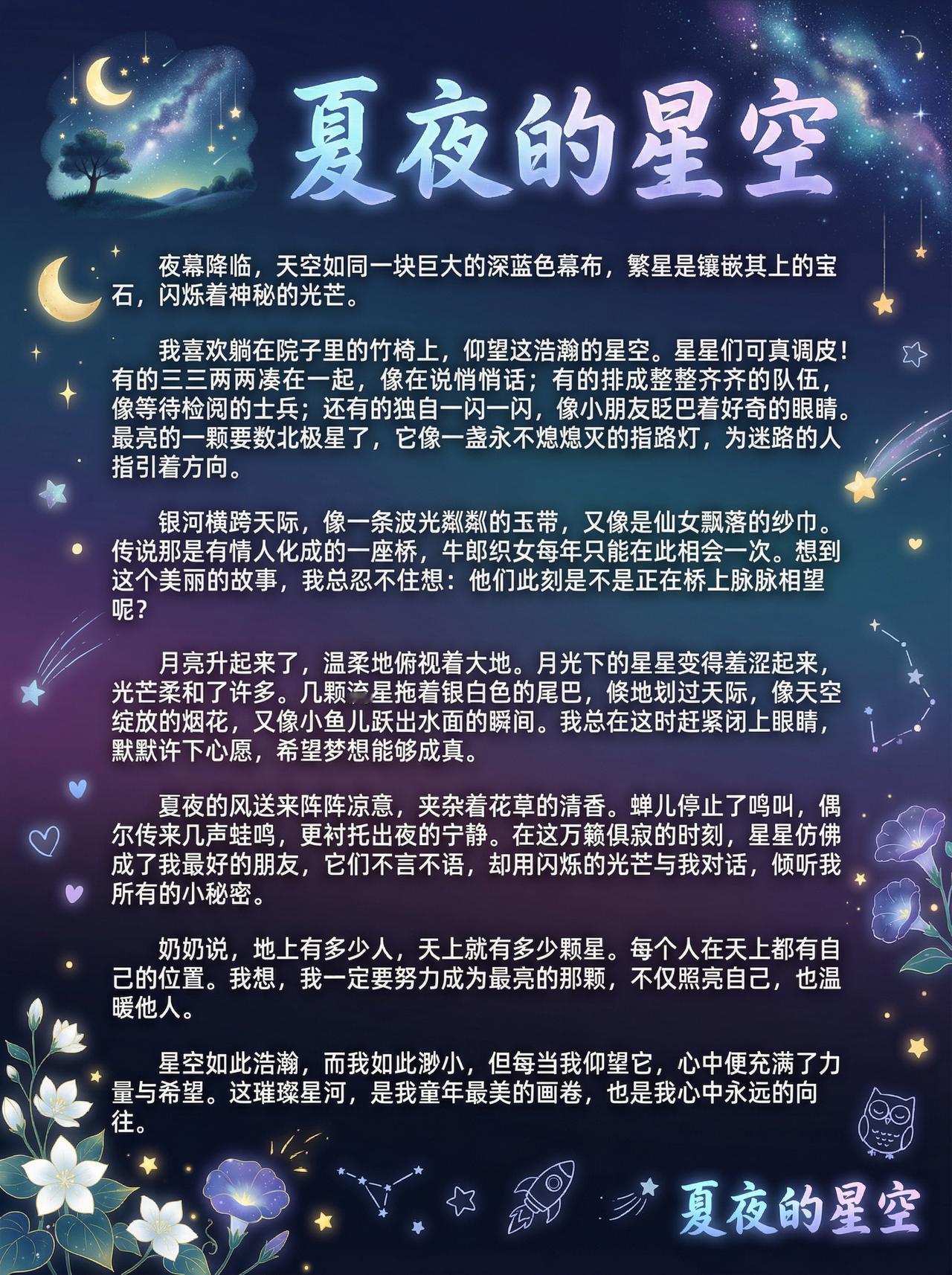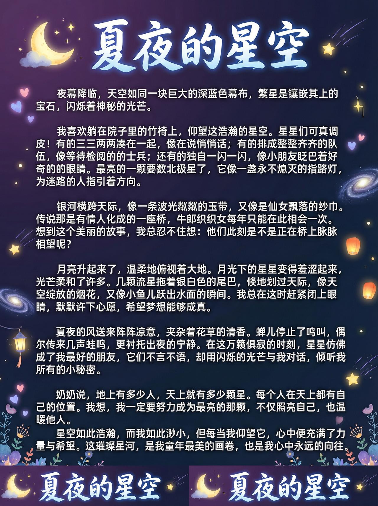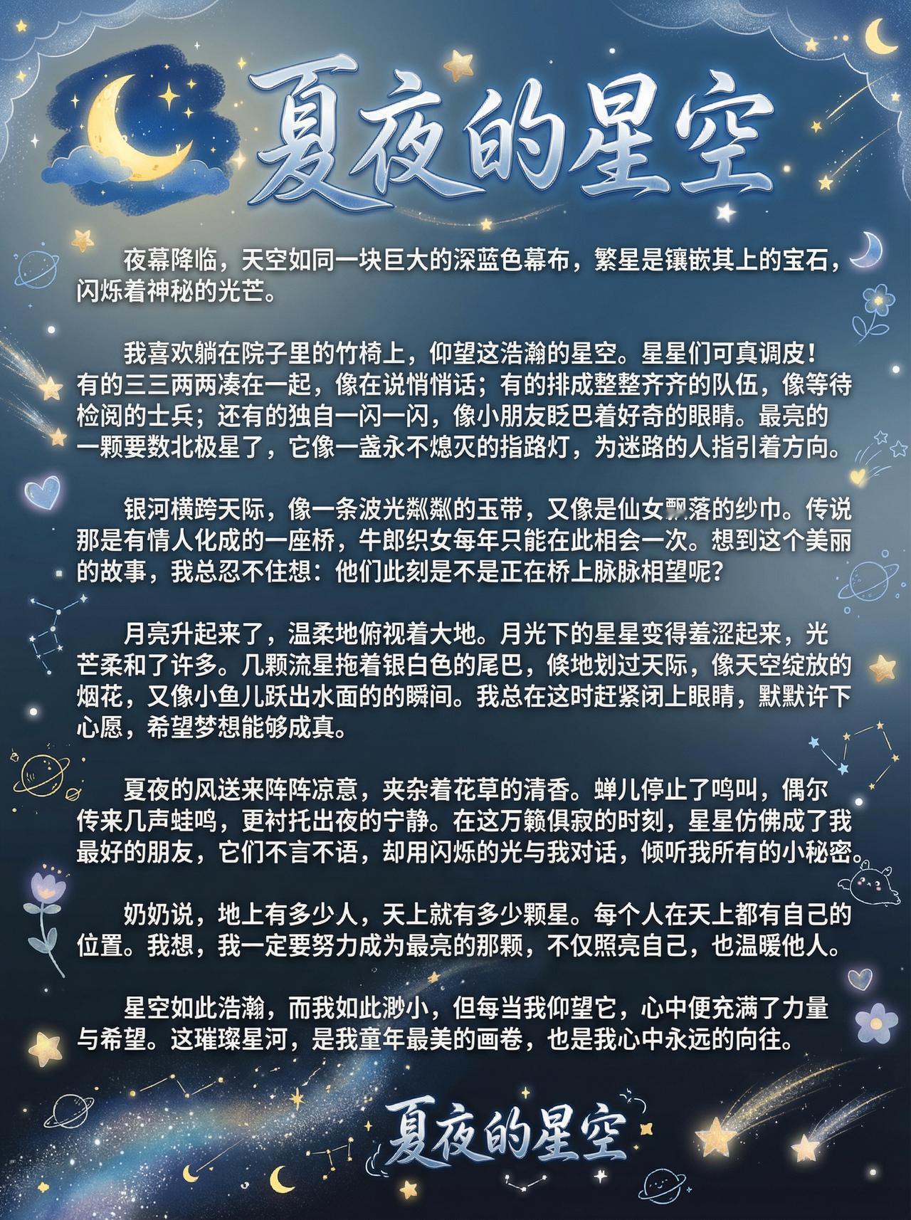 每日晨读美文:《夏夜的星空》 夜幕降临,天空如同一块巨大的深蓝色幕布,繁星是镶嵌其上的宝石,闪烁着神秘的光芒。 我喜欢躺在院子里的竹椅上,仰望这浩瀚的星空。星星们可真调皮!有的三三两两凑在一起,像在说悄悄话;有的排成整整齐齐的队伍,像等待检阅的士兵;还有的独自一闪一闪,像小朋友眨巴着好奇的眼睛。最亮的一颗要数北极星了,它像一盏永不熄灭的指路灯,为迷路的人指引着方向。 银河横跨天际,像一条波光粼粼的玉带,又像是仙女飘落的纱巾。传说那是有情人化成的一座桥,牛郎织女每年只能在此相会一次。想到这个美丽的故事,我总忍不住想:他们此刻是不是正在桥上脉脉相望呢? 月亮升起来了,温柔地俯视着大地。月光下的星星变得羞涩起来,光芒柔和了许多。几颗流星拖着银白色的尾巴,倏地划过天际,像天空绽放的烟花,又像小鱼儿跃出水面的瞬间。我总在这时赶紧闭上眼睛,默默许下心愿,希望梦想能够成真。 夏夜的风送来阵阵凉意,夹杂着花草的清香。蝉儿停止了鸣叫,偶尔传来几声蛙鸣,更衬托出夜的宁静。在这万籁俱寂的时刻,星星仿佛成了我最好的朋友,它们不言不语,却用闪烁的光芒与我对话,倾听我所有的小秘密。 奶奶说,地上有多少人,天上就有多少颗星。每个人在天上都有自己的位置。我想,我一定要努力成为最亮的那颗,不仅照亮自己,也温暖他人。 星空如此浩瀚,而我如此渺小,但每当我仰望它,心中便充满了力量与希望。这璀璨星河,是我童年最美的画卷,也是我心中永远的向往。 【斗半匠】337晨读美文1-6年级每日晨读书语文积累同步课本推荐课外