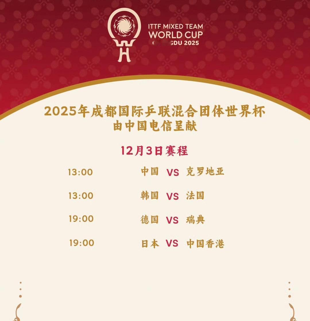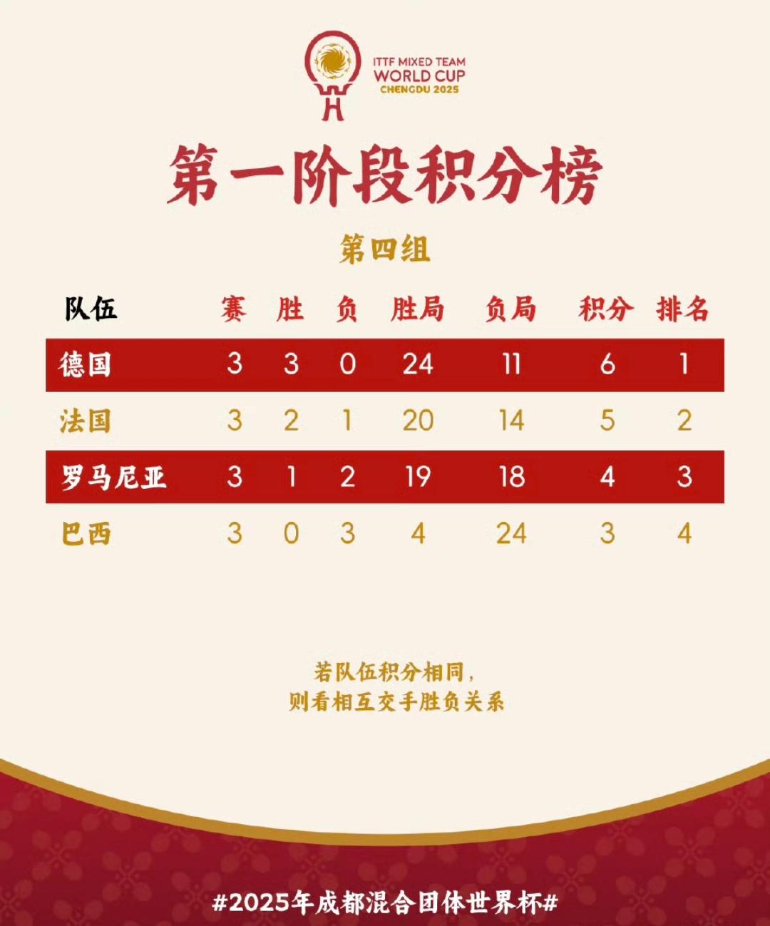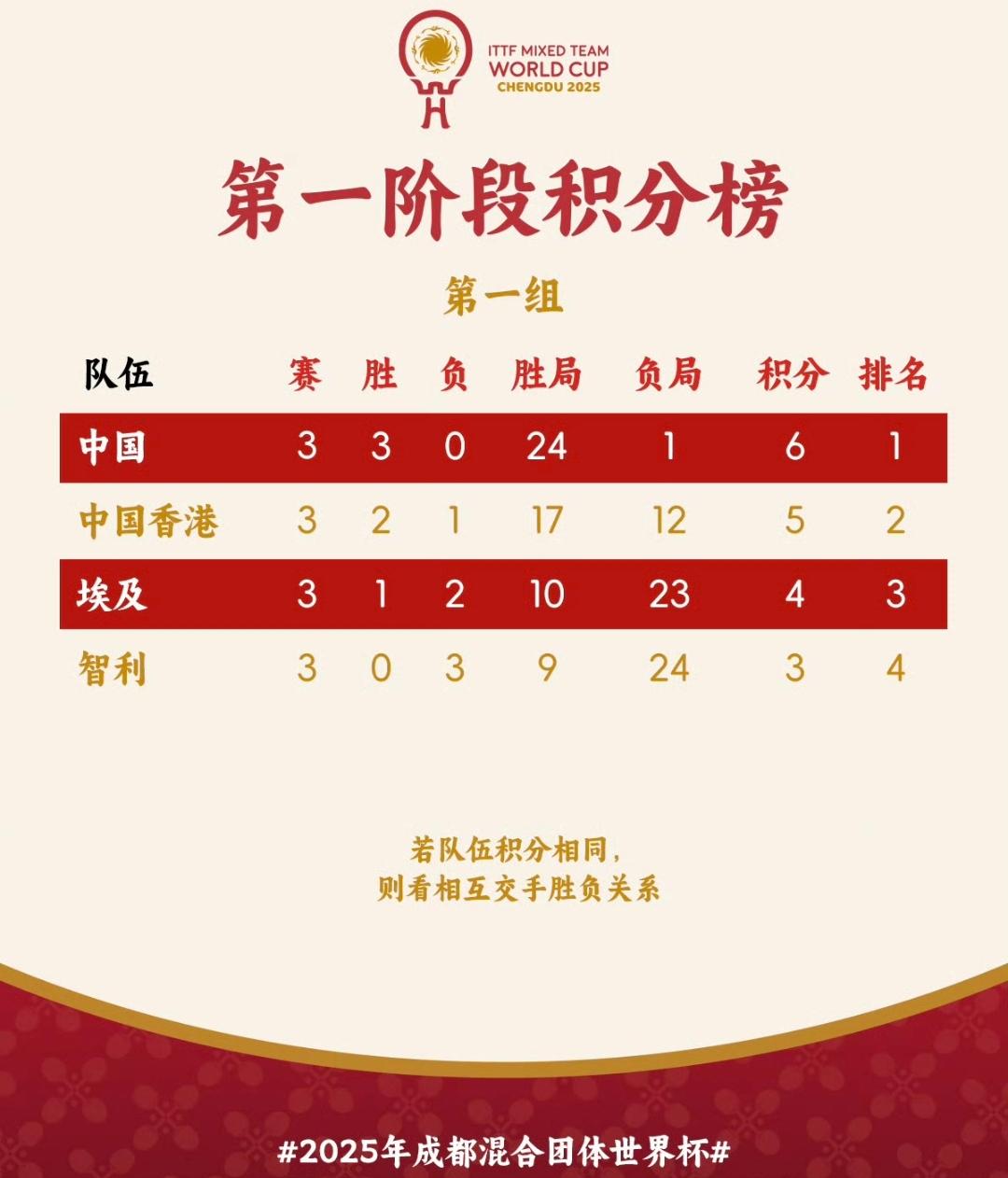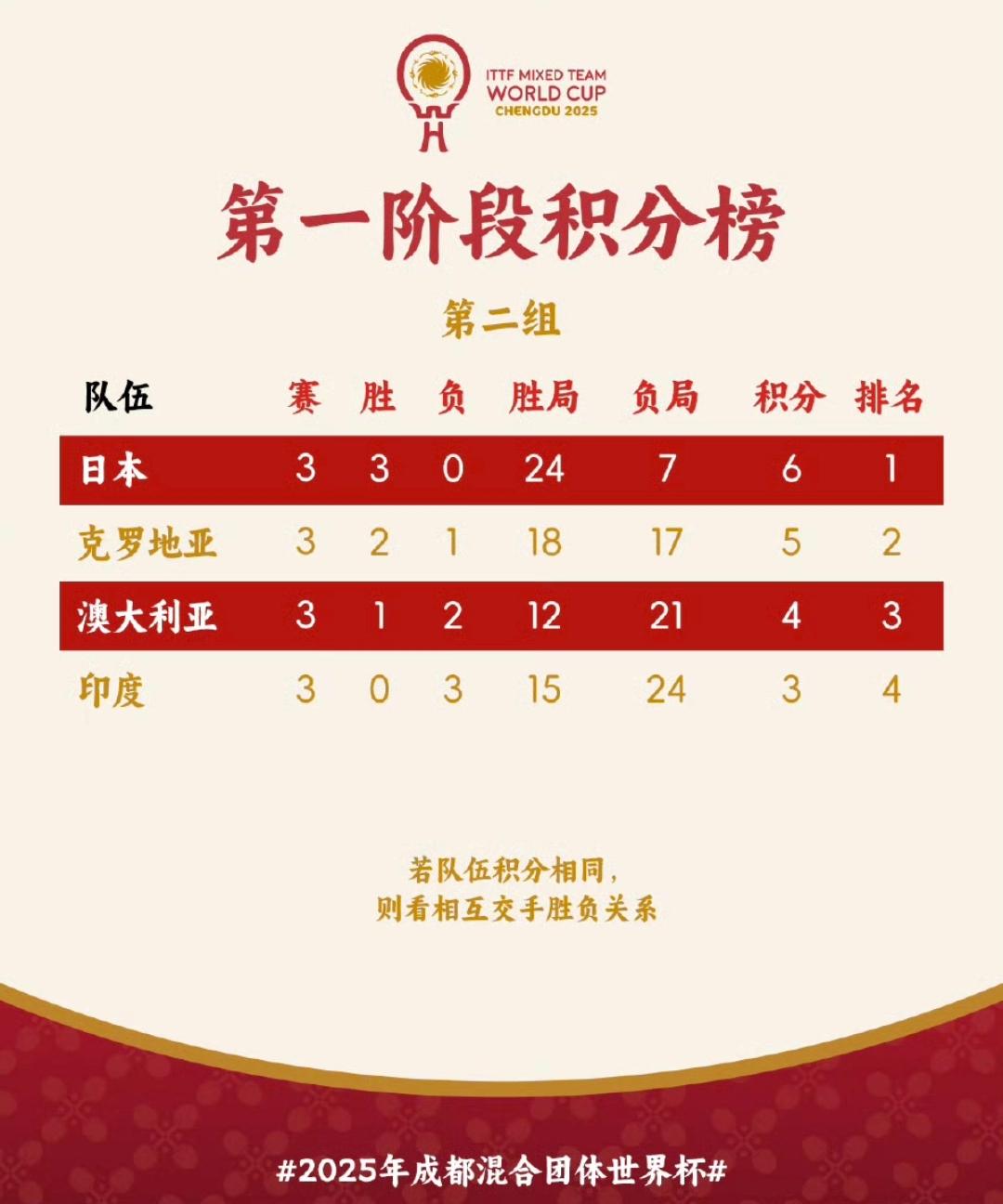 国乒晋级混团世界杯第二阶段! 2025年成都混合团体世界杯 第一阶段比赛结束,八支队伍从小组赛胜出,顺利晋级第二阶段! 中国队以24胜1负的战绩位居第一组第一;中国香港队以17胜12负战绩位居第二,其他晋级的队伍有:日本、克罗地亚、韩国、瑞典、德国、法国! 根据比赛规则,第一阶段交手的队伍在第二阶段不再交手,直接将第一阶段成绩代入,之后决出第三阶段的队伍! 今日赛程: 中国vs克罗地亚 韩国vs法国 德国vs瑞典 日本vs中国香港 加油国乒!