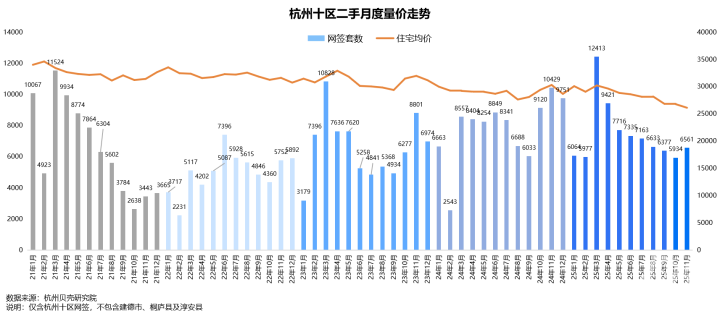 据杭州贝壳研究院最新数据,11月份杭州二手房网签6561套,环比提升10.6%,结束了自4月份以来连续7个月的下跌。与此同时,住宅网签均价却继续下探至26114元/平方米,环比下滑2.5%,同比下滑13.8%。“以价换量”趋势鲜明。