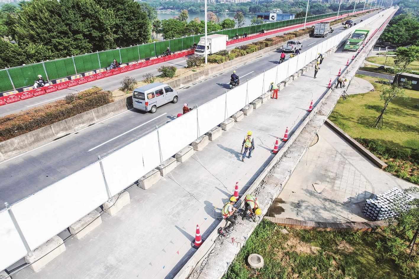 一是修复结构病害。全面排查并修复梁体裂缝、墩柱露筋等问题,更换老化支座与破损构件,从根本上消除结构安全隐患,恢复桥梁承载能力。二是优化通行环境。对桥面沥青进行铣刨重铺,提升路面平整度,同时优化“机非”隔离车道设计,明确通行空间,减少混行干扰,改善行车与行人通行体验,同步完善桥面排水系统,避免雨水积存对桥梁结构造成侵蚀。三是升级安全监测。增设声屏障、防抛网及助航设施,强化桥梁安全防护能力,同时构建实时监测系统,实现对桥梁运营状态的动态追踪,为后续养护管理提供数据支撑。