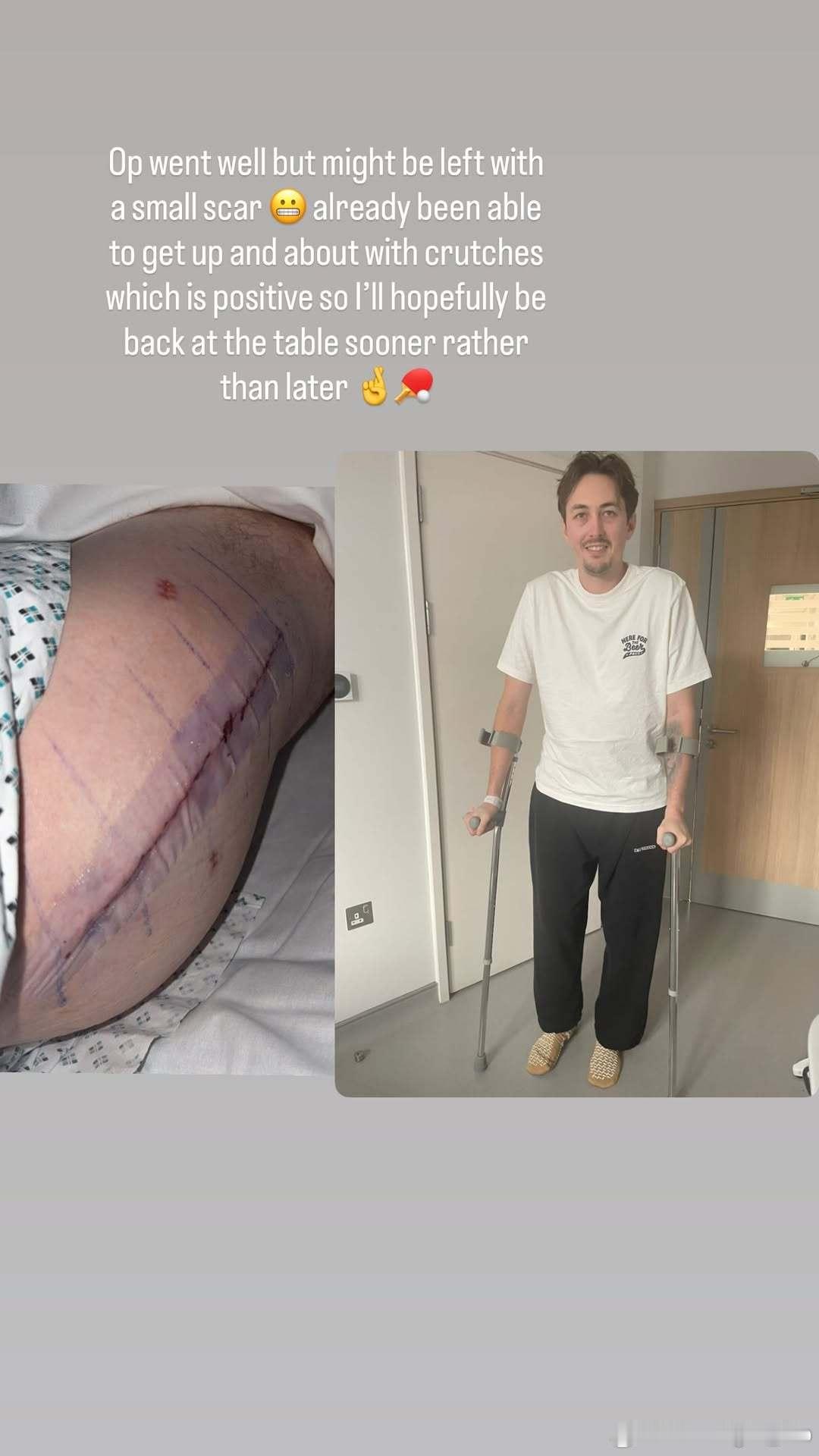 皮切福特:手术进行得很顺利,但可能留下了一个小伤疤😬已经能够用拐杖站起来了,这是积极的,所以我希望能尽快回到球桌上🤞🏓️