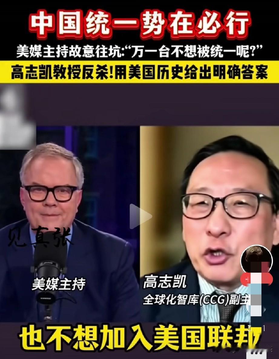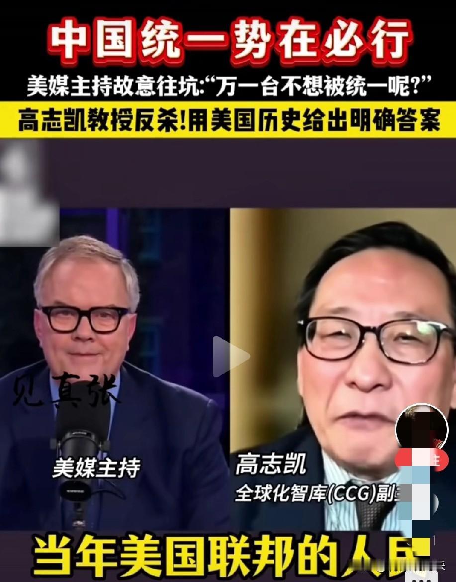 美媒主持人故意挖坑:“万一台湾民众不想被统一呢?”高志凯教授的反击绝了! 当美国媒体主持人询问高志凯教授,万一台湾民众不想被统一呢?”高志凯教授犀利反击,当年美国南北战争时,南方联邦民众不愿意加入美国联邦,你们的林肯总统是怎么做的?考虑南方民众的感受了吗? 然后现在这些南部州已经是美国的一部分,用美国历史给出明确答案,台湾问题也是一样,中国终究会完成统一。 高志凯教授用的这一手“以彼之矛,攻彼之盾”是出神入化,这是啪啪打老美的脸啊,西方的双标,不堪一击。中国有句古话“正人先正己”,西方永远没有这个道德高度。 万一不同意,台湾这片地方我们也要收回来,不愿意的人可以走,没非得要留你们!岛上都是于北辰这种,智商的道德的洼地。