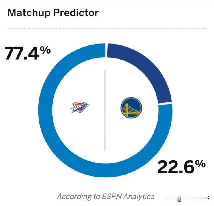 ESPN真是太看得起斯蒂芬-库里了!今天勇士将会坐镇主场迎战卫冕冠军雷霆,在比赛开始之前,ESPN对本场比赛进行了一番预测,结果主场作战的勇士仅有22.6%的赢球概率,而雷霆获胜的概率高达77.4%。 坦白说,ESPN之所以如此的看衰勇士,其中最重要的原因就是库里会因伤缺阵本场比赛。在我看来,ESPN真是太高看库里了,我觉得勇士在库里缺阵的情况下反而会打得更好,球队的进攻会更加流畅。