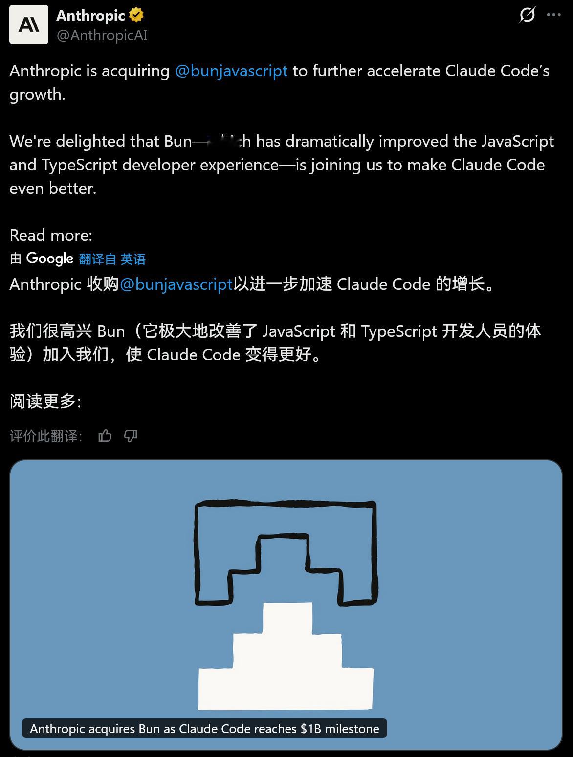 Bun被Anthropic收购。Anthropic 会将 Bun 作为 Claude Code、Claude Agent SDK 及未来 AI 编程工具和产品的基础设施。 图3网友梗图。。