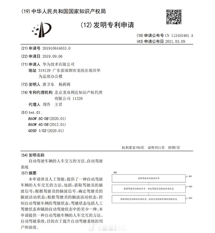 吕俭的汽车科普圈 今天聊聊汽车疲劳监测方式。过去最常见的疲劳监测方式有两种,一种是手部脱离,一种是视线脱离。这两种监测方式都有人卡bug。比如手部脱离,有人会买专门的配件,给方向盘施加压力,让方向盘误识别,甚至有些车直接用水瓶卡住方向盘一角就能被误识别。视线脱离也是类似,搞一个假人眼罩或者用真人照片贴在摄像头前,也能误识别。虽然公安部组织起草的《机动车运行安全技术条件》征求意见稿要求辅助驾驶系统必须同时采用“手部脱离”和“视线脱离”检测,但这个做法也不一定完美,实在想规避的也能采用上述方法解决。那还有没有什么更好的,更不容被简易装置糊弄的呢?我想脑波监测或许是一个思路。比如华为申请的专利CN201910844653.0 "自动驾驶车辆的人车交互的方法、自动驾驶系统"。这个专利提供了一种自动驾驶车辆的人车交互的方法,包括:1、获取驾驶员的脑波信号;2、根据驾驶员的脑波信号,确定驾驶员的脑波活动状态;3、根据驾驶员的脑波活动状态,控制自动驾驶车辆的驾驶状态,驾驶状态包括人工驾驶状态和辅助自动驾驶状态中的至少一种。所谓的脑电波监测,是通过电极帽采集驾驶员的脑电波信号,不同的脑电波频段(如θ波、α波、β波)反映了大脑的不同活动状态。疲劳时,θ波和α波的功率会增加。华为这份专利与传统的脑波监测不同之处在于,它还考虑了眼部活动状态、生物特征活动状态。眼部活动状态好理解,什么是生物特征数据呢,它包括脉搏数据、心跳数据、血压数据中的一个或多个。这也不是不可行的,比如手表这些穿戴设备就能监测人的脉搏数据、心跳数据、血压数据,这时候只要这些穿戴设备能与汽车联网,他们确实能实现数据共享。华为这份专利提到,他们会综合这些信息,控制所述自动驾驶车辆的驾驶状态。总之了,虽然脑波监测方式还很另类,但说不定呢?这波更利好做智能生态的企业。