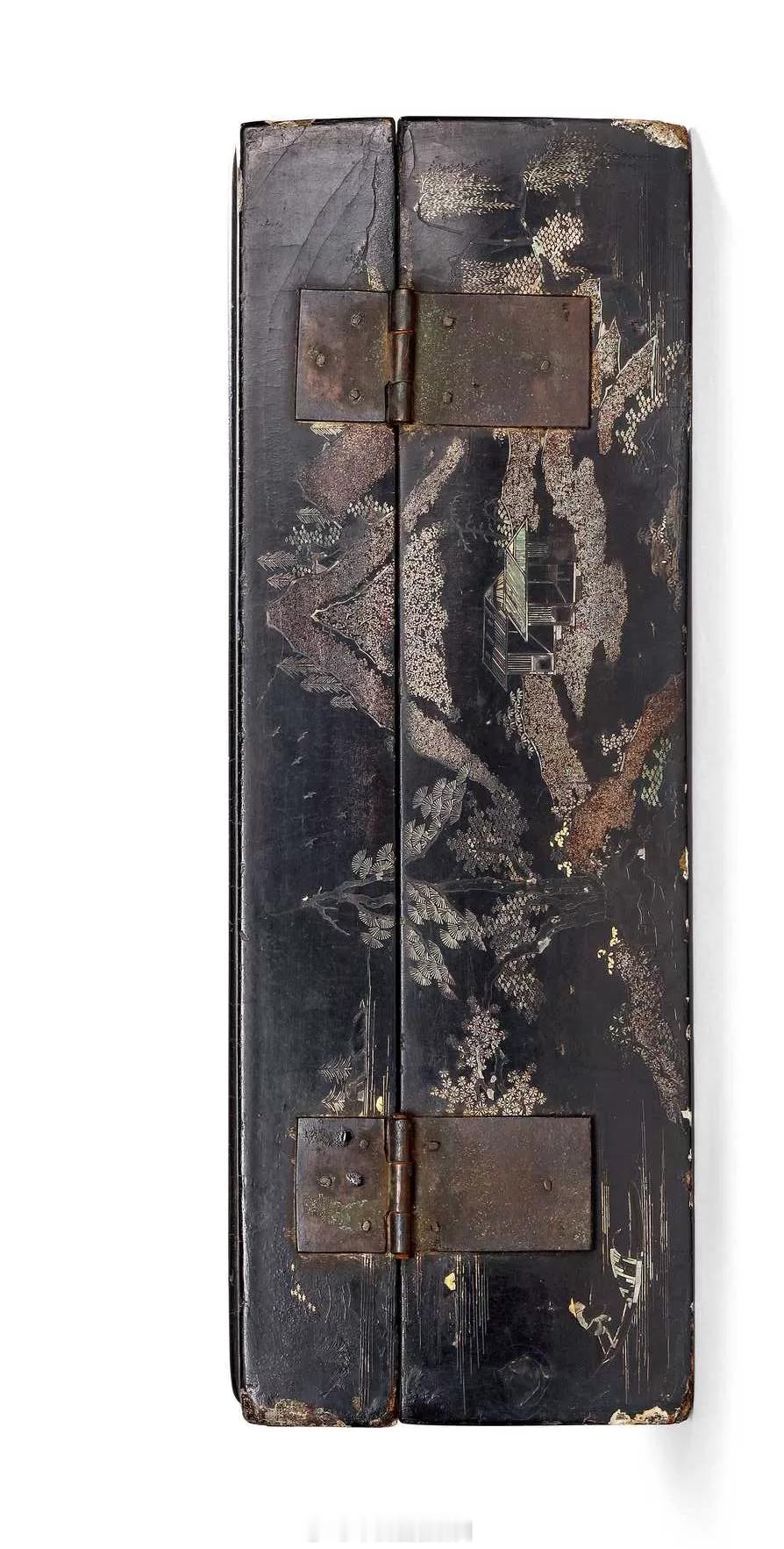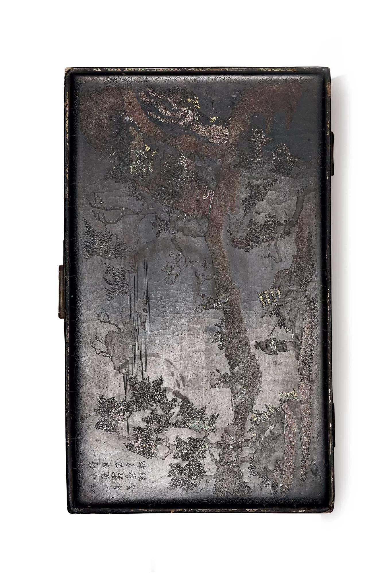 髹饰录 | 清早期 黑漆螺钿秋山行吟图长方盒长方盒造型简练,盖顶微鼓成“面包顶”样式,甚为饱满。通体髹黑漆,上嵌薄螺钿,辅以金银片及螺钿沙,饰山水人物图案,盒面为唐杜牧《山行》诗意图。顶盖画面为一处坡岸,远处水落石出,枯木倾仄,秋风瑟瑟之感顿生。近景处左侧两株大树,树叶婆娑,为风所动,其下坐一文士,手持折扇,头巾、衣物随风飘动,但神态安逸,坐于石上,正在欣赏画面右侧的山景。其前有童子手指右侧山石,山石上则倒挂、斜生数株树木,有的树叶已被秋风所夺,有的叶片尚茂,随风翻卷,甚具动势,显示秋风之烈。画面下方车夫停车于山石旁,车上附有两出头宝座式椅,靠背搭附锦绣椅披,以螺钿和金片嵌为锦地,甚为华美,一旁车夫袖手缩脖,与文士安逸潇洒的神态形成鲜明对比。画面左上角嵌饰行草书“停车坐爱枫林晚,霜叶红如二月花”。盒四周嵌饰山水人物,有野炊赏景、岛屿茅屋、野村渔归、江边赏月等景,嵌饰工整,物象生动,画意充足,当出自名家手稿,高手制成。此类镶嵌的箱盒,多为康熙初期所制。尺寸:长27cm;宽16.5cm;高9.5cm来源:保利2025秋拍《醉花荫—海内外名藏漆器》