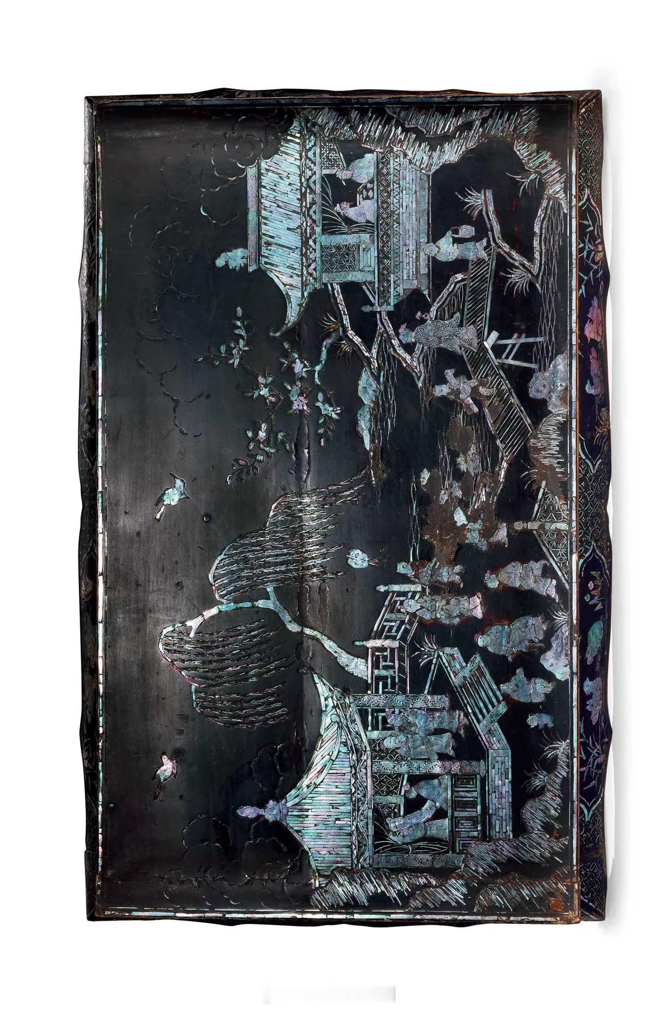 髹饰录 | 明末清初 黑漆薄螺钿庭院雅集图三弯腿小翘头几小翘头几尺寸可爱,高束腰三弯腿式,造型古朴简练,通体髹黑漆,嵌薄螺钿饰山水人物、花鸟等纹饰,华丽璀璨,是一件甚为高档的案头文房。案面嵌饰庭院雅集图,文人雅士于水岸两侧雅集,右侧为一须弥座上之畅厅,斗拱罗列,飞檐起翘,螭首硕大,厅堂内两个文人倚案而坐,正在品茗。一旁之字板桥,其上人物驻杖而来,童子携琴相随。左侧庭院内数个文人雅集,其中两人坐于方、圆凳上,童子献茶。四角攒尖亭内,三个文士正在欣赏书画,童子展开一个卷轴,上有楷书“新马杏花色,绿香青风”。出自唐韦庄诗《送崔郎中往使西川行在》:“新马杏花色,绿袍春草香。”桥下习水潺潺,岸边柳树、桃树对立,一派春光。镶嵌裁成教大片螺钿,拼为物象主体,再以刀划刻细节,衣物、建筑等多以各式锦地表现。案面两端小翘头,造型微妙,颇具力度,边抹嵌饰球路纹套四瓣花锦地。高束腰,腿足露明,内镶绦环板,嵌饰十字菱花格锦地,内有笔管式开光,嵌竹丝编。束腰下有托腮,嵌饰香草纹。鼓腿膨牙,牙板锦地上菱花形开光,内嵌饰花鸟纹,构图清雅,物象生动,颇具宋画小品意趣。牙板挖壸门,沿边起线,腿足三弯,颇为柔美,其上嵌饰缠枝花纹。尺寸:长53cm;宽33.7cm;高19cm来源:保利2025秋拍《醉花荫—海内外名藏漆器》