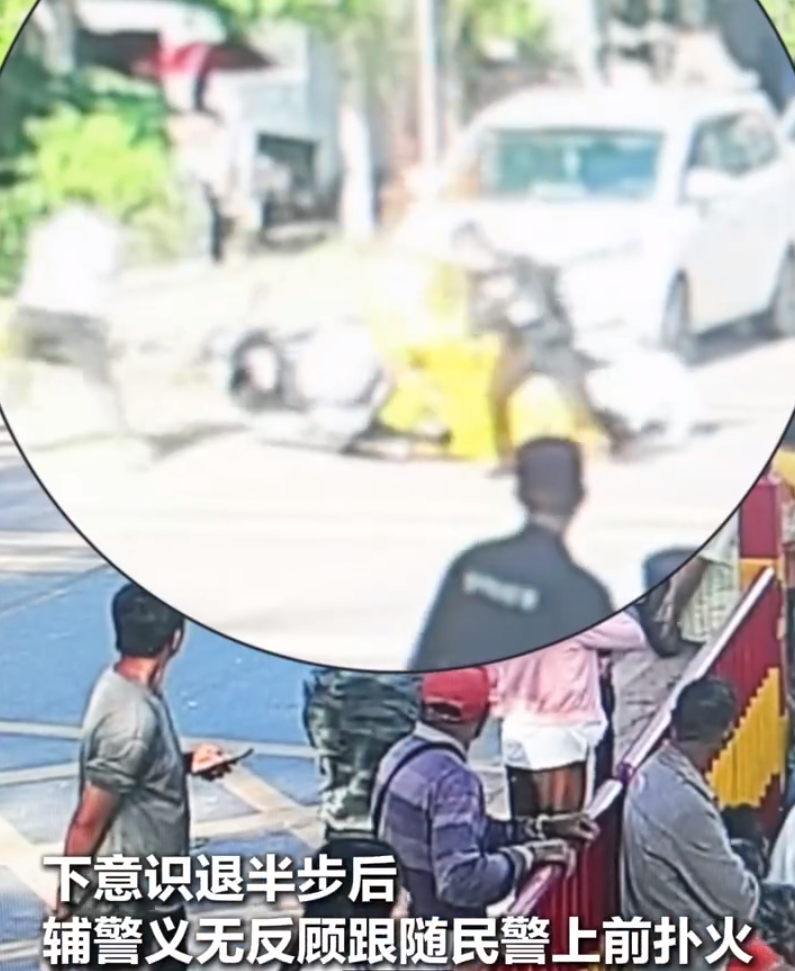 近日,云南普洱康平镇,一女子驾驶的摩托车失控,连人带车摔倒在地。执勤辅警杨思跑去搀扶,摩托车却突然爆燃。杨思下意识后退半步,但看到车主身上有明火,又义无反顾冲上去,摘下警帽拍打火焰。现场民辅警和热心群众也取来灭火器支援,几十秒后,明火被扑灭。
