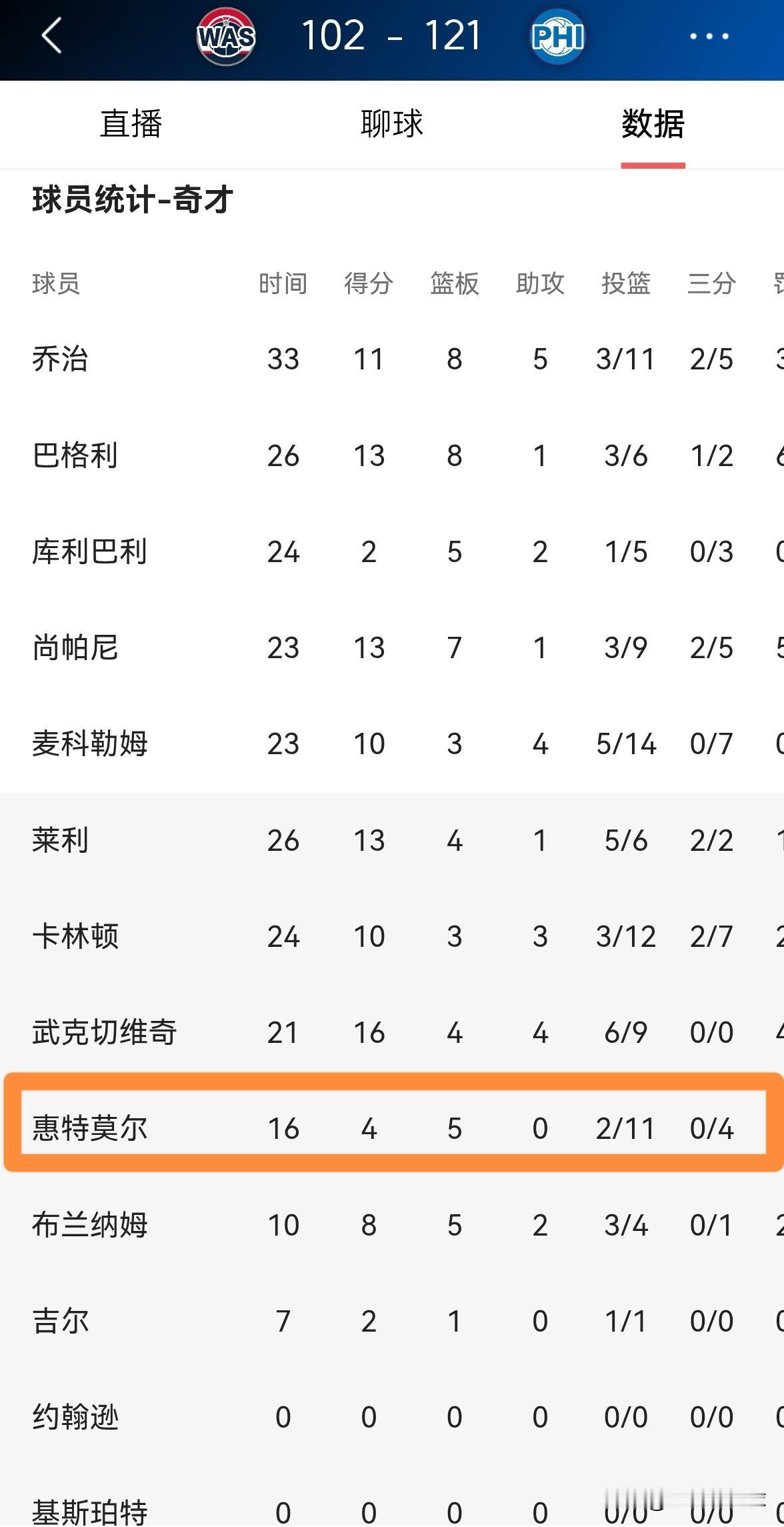 奇才超级新星惠特摩尔真是彻底的废了!在今天奇才客场以102:121惨败于76人的比赛中,惠特摩尔替补出战16分钟,投篮11中2,其中三分球4中0、罚球2中0无比低效的得到4分,他的场上正负值为-18。 以目前的情况来看,惠特摩尔在奇才已经没有出头之日了,他一次又一次的糟糕表现让奇才球迷看的心痛。