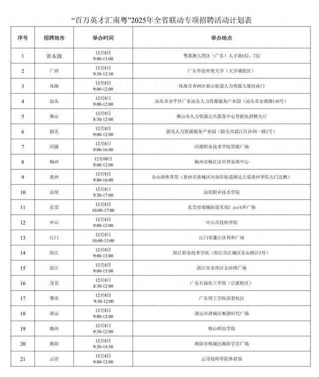 本次全省联动专项招聘活动围绕“粤聚英才、粤见未来”主题,由广东省委人才办、省人力资源社会保障厅、省教育厅主办,各地市党委人才办、人力资源社会保障局、教育局联合承办,以“1+20”模式铺展,省本级+各地市同步发力,线上线下组织优质岗位超2万个,同时常态化岗位约10万个,集中一天时间打造“全省招聘一张网”,聚焦广东省20个战略性产业集群及未来产业需求,打造集中高效的招聘盛宴。