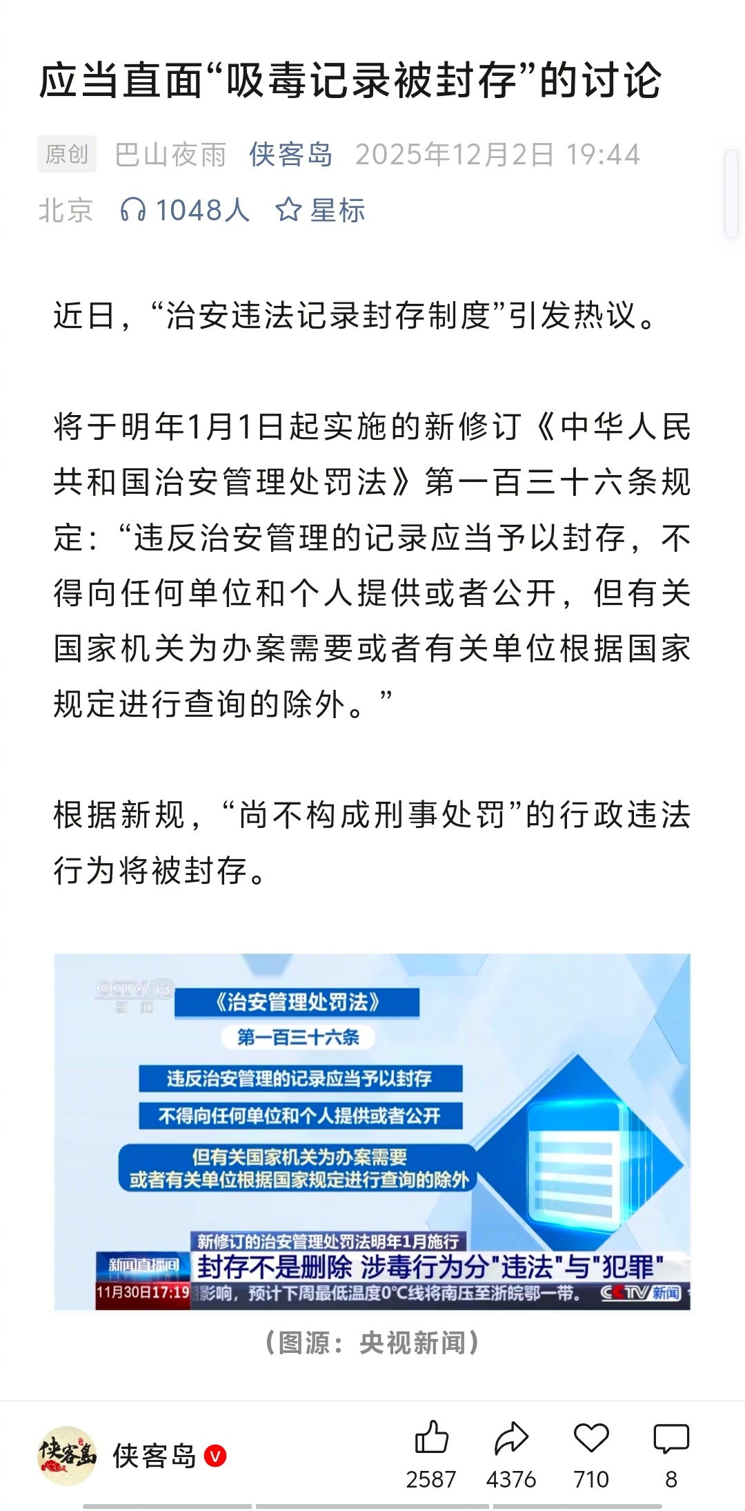 『侠客岛』与『团结湖参考』等媒体都在关注吸毒封存这事了!