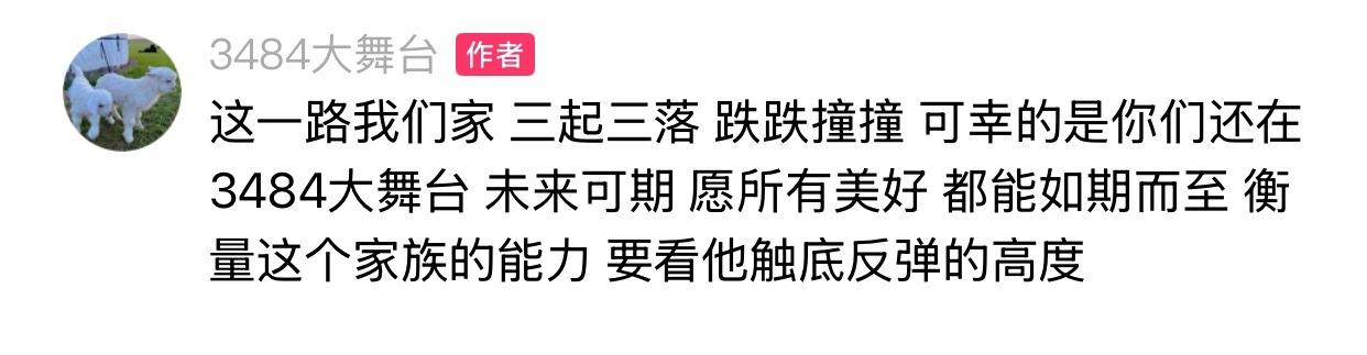 仙洋发文:这一路我们家三起三落,跌跌撞撞,可幸的是你们还在,3484大舞台未来可期,愿所有美好都能如期而至,衡量这个家族的能力,要看他触底反弹的高度!