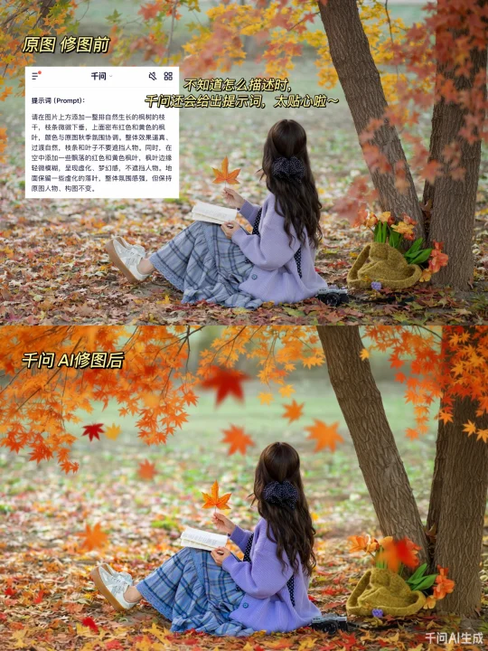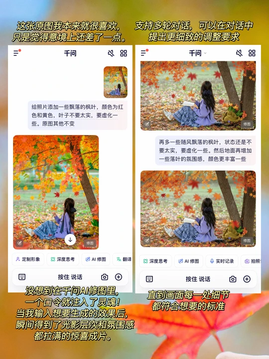 这个秋天,不用等风、不用等落叶,有千问AI修图,每一张都是完美瞬间~