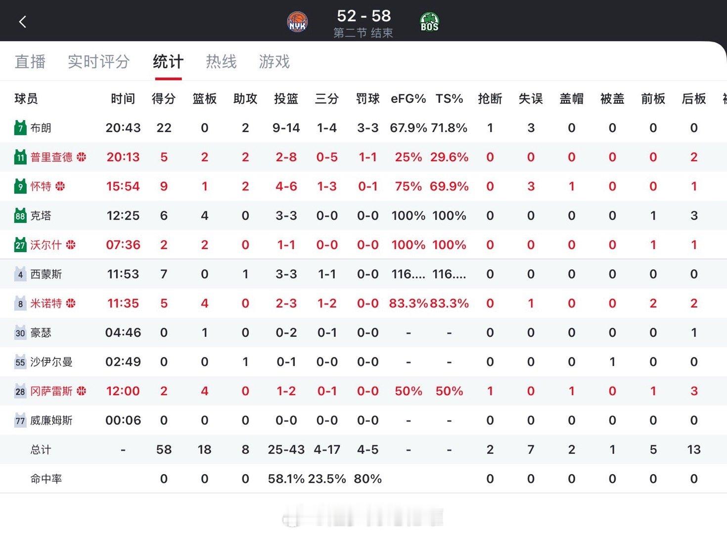 半场结束,凯尔特人58-52尼克斯🔥布朗22分2助攻,怀特9分,小西蒙斯7分,