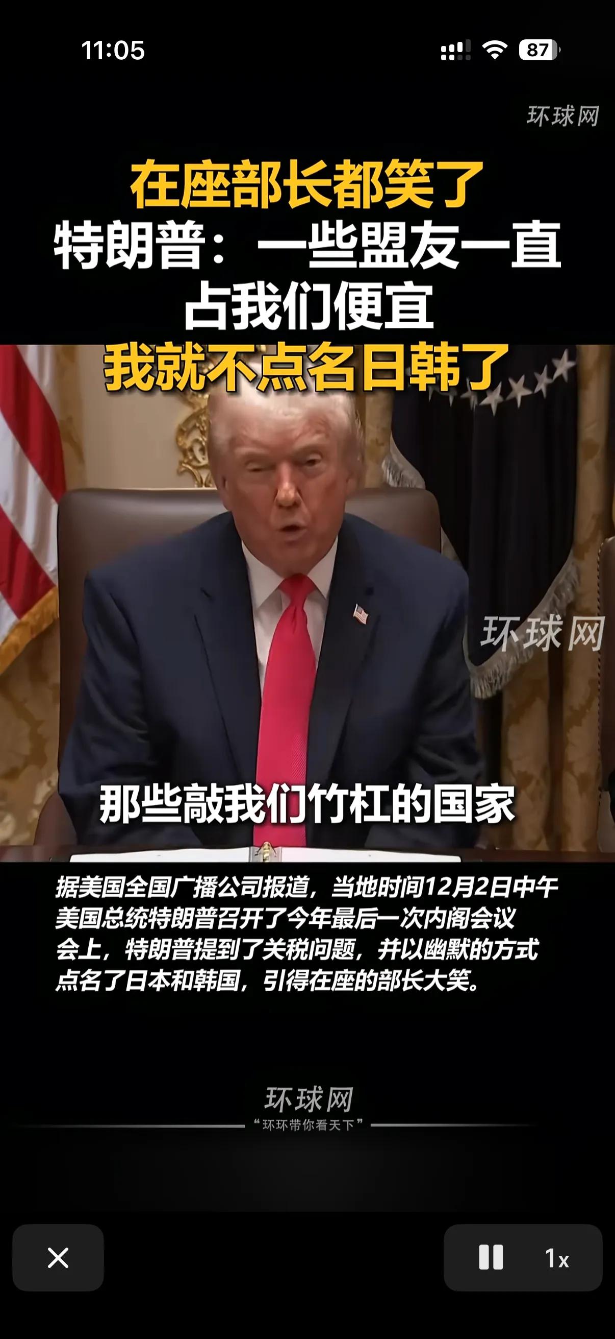 日本和韩国正在偷美国的利益! 特朗普在昨天的讲话里公开阴阳韩国和日本!引来参会人员笑声! 日前特朗普在一场会议里称,现在自己国家的一些盟友正在以前所未有的方式在占么过的便宜,然后又说自己不能点日本和韩国的名字! 这和直接点名也没啥区别了! 要知道在不久前的特朗普访问日本和韩国的时候可是要了日本和韩国的不少投资,当然了在得到这些投资后,美国在日本和韩国自己军备方面也松口了! 估计这就是特朗普口中的日本和韩国正在以特殊的方式敲竹杠了! 也有些媒体人士猜测,特朗普是又想从自己盟友口袋里掏钱了,反倒是特朗普要在圣诞前为美国多敲诈些钱来过圣诞了!
