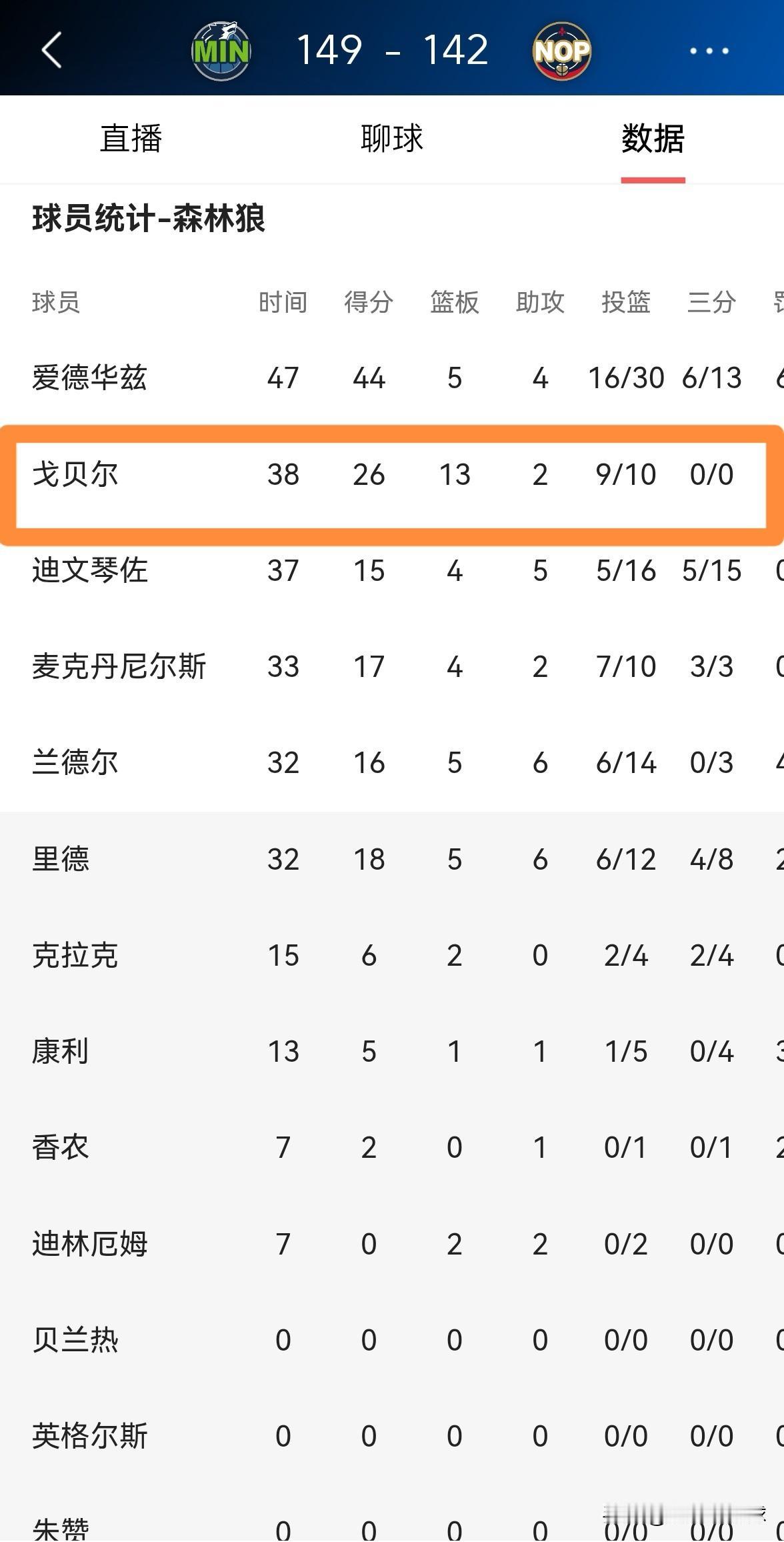 森林狼超级中锋戈贝尔真是予取予求!在今天森林狼客场以149:142击败鹈鹕的比赛中,戈贝尔投出了让人瞠目结舌的命中率。 整场比赛下来,戈贝尔首发出战38分钟,投篮10中9,其中罚球10中8极其高效的砍下26分13篮板1抢断1盖帽,他的场上正负值为+9。 毫不夸张的说,本场比赛戈贝尔在篮下真是得吃得喝、予取予求。