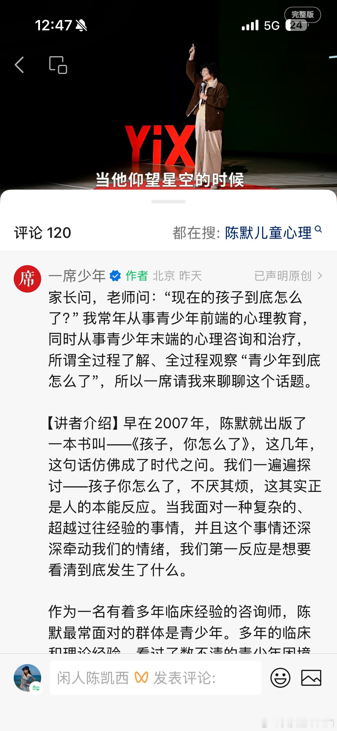 今天做中饭的时候听了陈默老师的这期视频句句掷地有声啊推荐感兴趣的网友空的时候可以听听我不多做评价每个人对这期内容应该都会有自己的看见我在这期视频里的一个看见是我们安安每天回家作业基本都做完了回家基本就是一个扫尾动作或许是因为家里“太好玩”了有很多好玩的事情等着她有她想看的书有她想玩的游戏有她想看的娱乐节目她得争分夺秒把作业先做完不然影响她在睡觉前的娱乐时间我得保护她的这份内驱力尽量不去破坏她尽量不在她兴冲冲做完作业的时候给她布置额外的事打断她想做的事,如果有事要做,提前商量好视频中关于手机的部分也让我有了新的看见安安 4 岁就有自己的手机了目前没有什么问题手机对她来说就是个工具有需要的时候拿出来不需要的时候经常因为长期没用没电了而找不到等她长大一些有社交需求会自己上网搜资料的时候不知道会不会有矛盾出现我会一如既往地观察,观察作为家长我们需要探索矛盾的根源关注孩子真实内在的需求宝贝成长守护计划