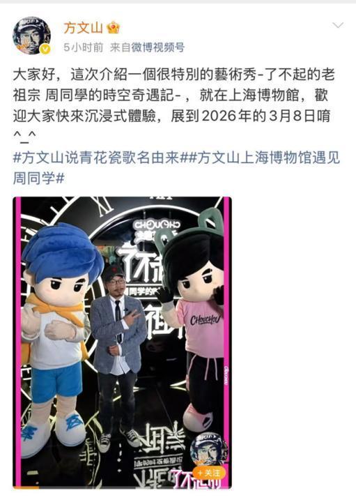 “老祖宗的智慧有多潮?来上海博物馆见证答案!”近日,知名作词人方文山在社交平台发布推介视频,热情邀约观众打卡“了不起的老祖宗——周同学的时空奇遇记”主题艺术秀。这场将持续至2026年3月8日的文化盛宴,因他的“带货”迅速引爆关注,让上海博物馆这场传统与潮流的跨界实践,成为大众热议的文化新焦点。