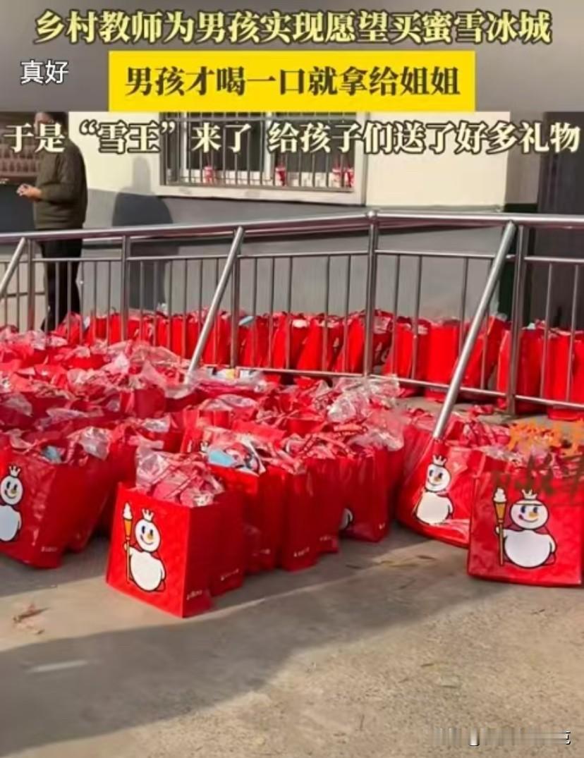 蜜雪冰城有大爱! 乡村教师为男孩实现愿望买蜜雪冰城,男孩才喝一口就拿给姐姐。于是“雪王”来了,给孩子们送了好多礼物! 多好,多有爱心的企业,蜜雪冰城 这次为香港大埔火灾捐款2000万港元。就爱点雪王的奶茶,就冲它便宜还老爱给灾区和有需要的人捐款,感觉我喝的不是奶茶而是给需要的人捐款,奶茶只是附带品。 无论是否是营销手段,只要企业为社会上的软弱面出钱出力的,我都一律买企业产品。每个人支持一杯,很多留守儿童和老人,都会开心好几天。