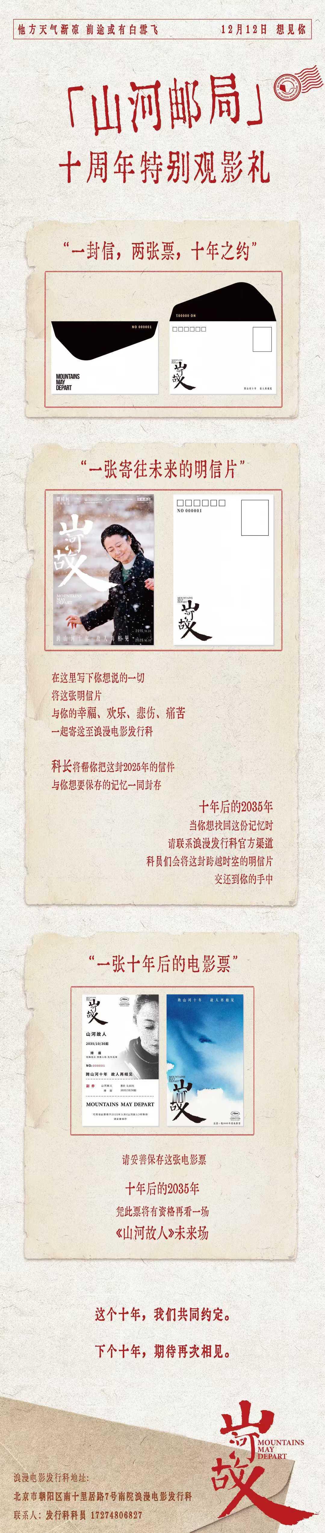 这次《山河故人》十周年复映,浪漫电影发行科配合制作了限量50000份的周边礼包,明信片回寄有机会保存到科长本人手里,电影票可以在10年后的2035年重映再看一场。之前《风流一代》公映的时候,科长背的那个“风流一袋”就很出圈,这回的策划也是很有节目。跨年电影愿