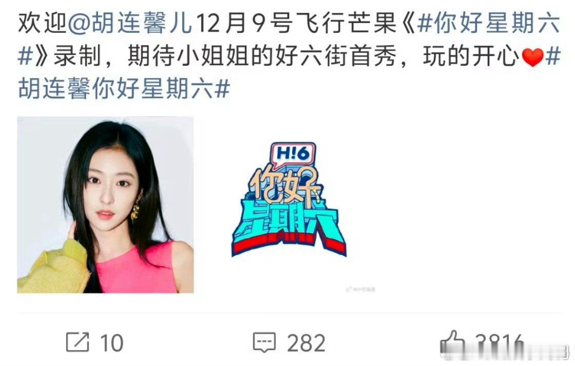 胡连馨录制你好星期六你好星期六大家别执着于胡连馨录制好六的网传消息了,本周节目才值得关注。听说有精彩的环节设计,坐等湖南卫视和芒果TV开播。