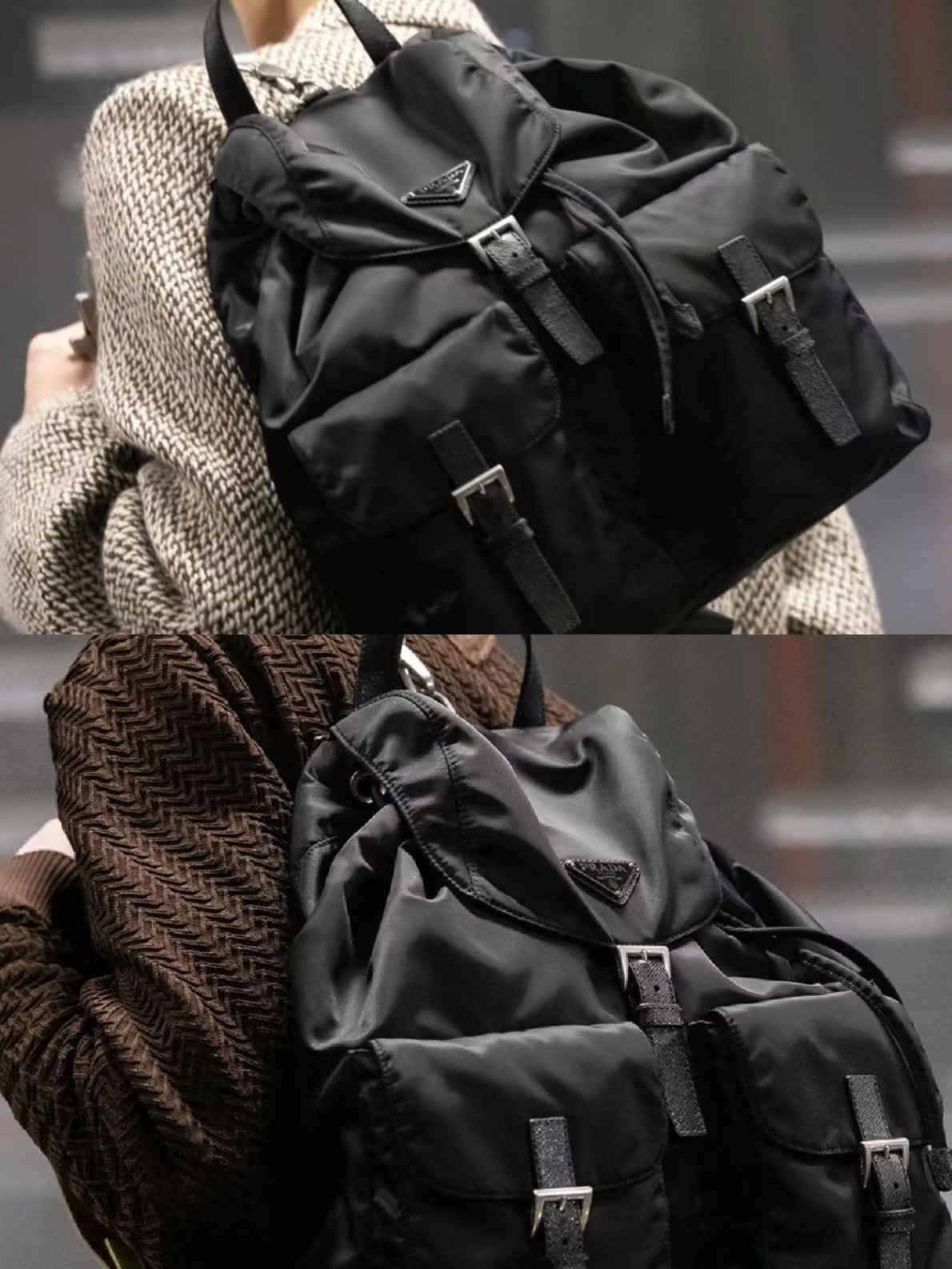 再生尼龙材质是拿回收的海洋塑料废弃物做的,防水又耐造,自重轻到像背了个空气包,涂珐琅金属三角标也一整个显贵,容量还大到能塞下电脑和补妆包,分区口袋连耳机都能精准归位!环保党+实用党+颜控党直接冲,这只“明星同款团宠包”,不冲真的亏!