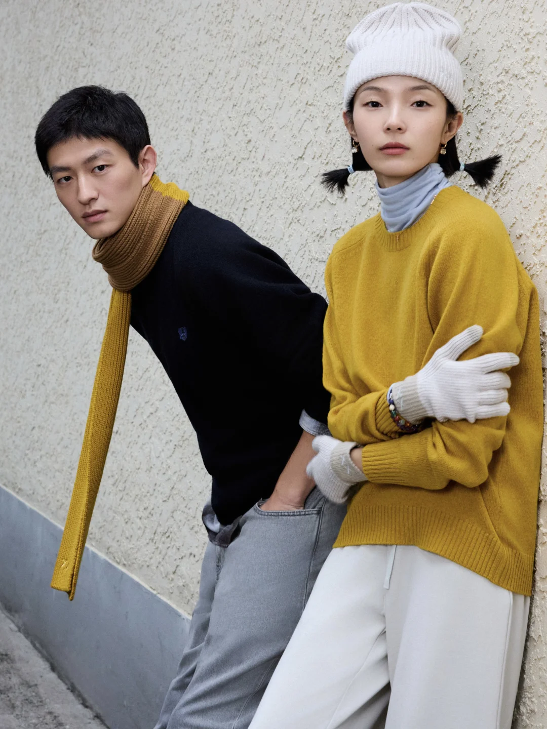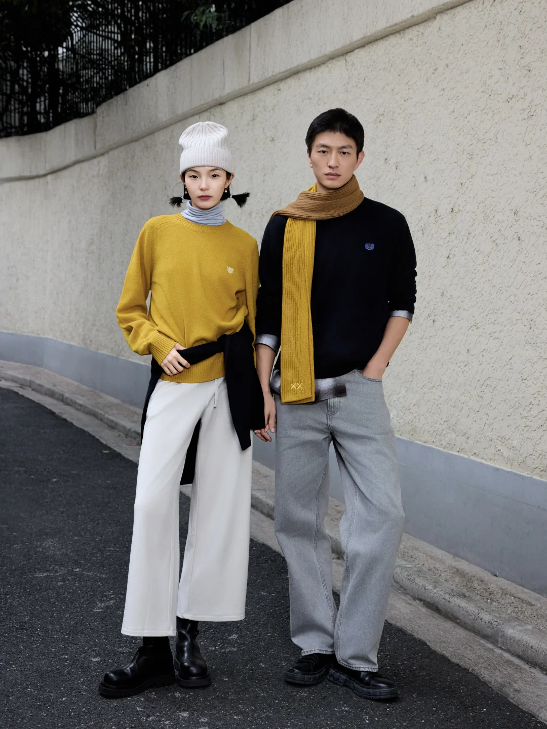 金大川藏蓝针织搭配姜黄围巾与雎晓雯上身姜黄相呼应