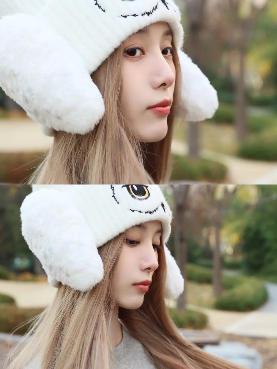徐艺洋上身灰色羊绒针织🧶搭配简单的蓝色牛仔裤,点缀白色针织帽