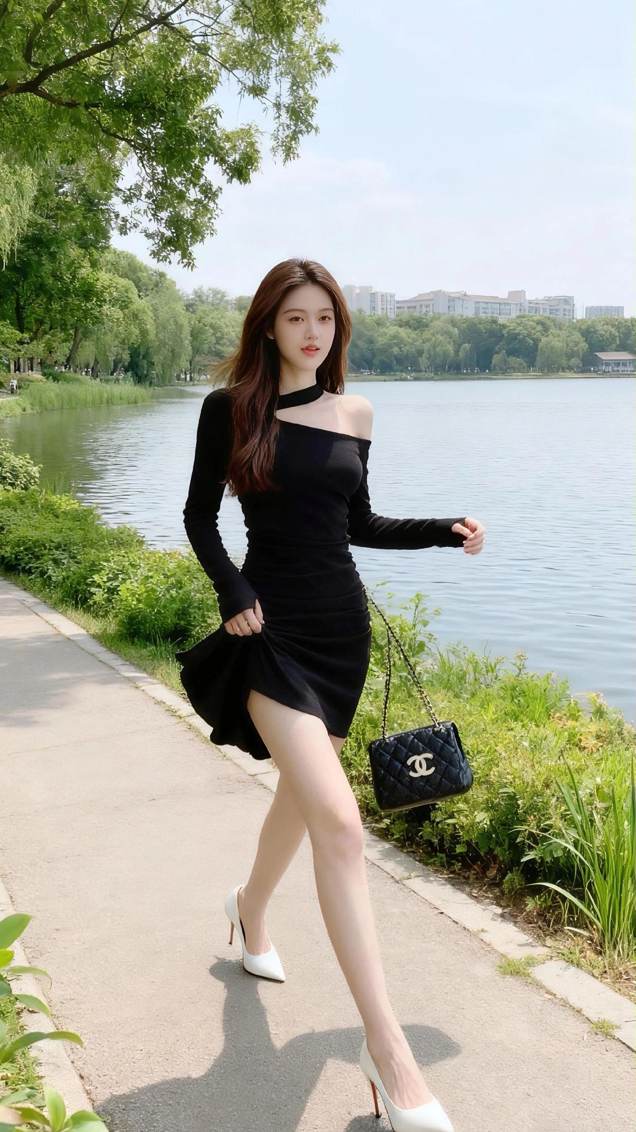 湖岸的风裹着夏意,将柳丝揉成软的帘。她走在水色与绿意的褶皱里,黑裙是裁了一捧暮色的绸,露肩的线条又漏进几缕碎金的光——像把晴日的温柔,一半藏进衣褶,一半亮在眉梢。 白鞋敲着石径,步子轻得让草叶都垂着腰晃。包链的金属响是碎的,混着水波的软,漫过她抬眼时弯起的眼尾。风掀了掀裙角,她随手按下去,指尖沾的都是湖光的凉。 这一程不用赶,连影子都懒在石板上,跟着她把湖岸的时光,走成一帧帧浸了青的诗。 高级感穿搭 穿搭 时尚连衣裙 好身材好气质