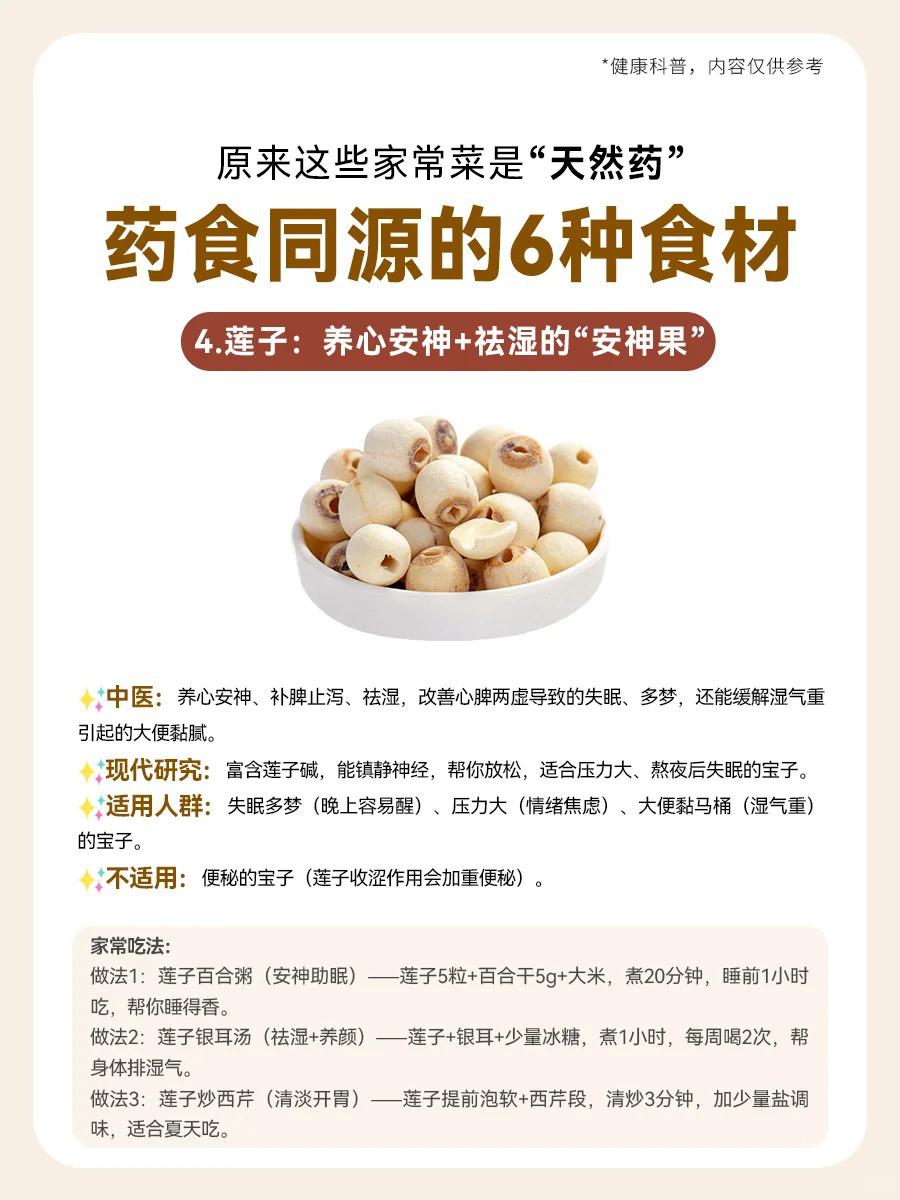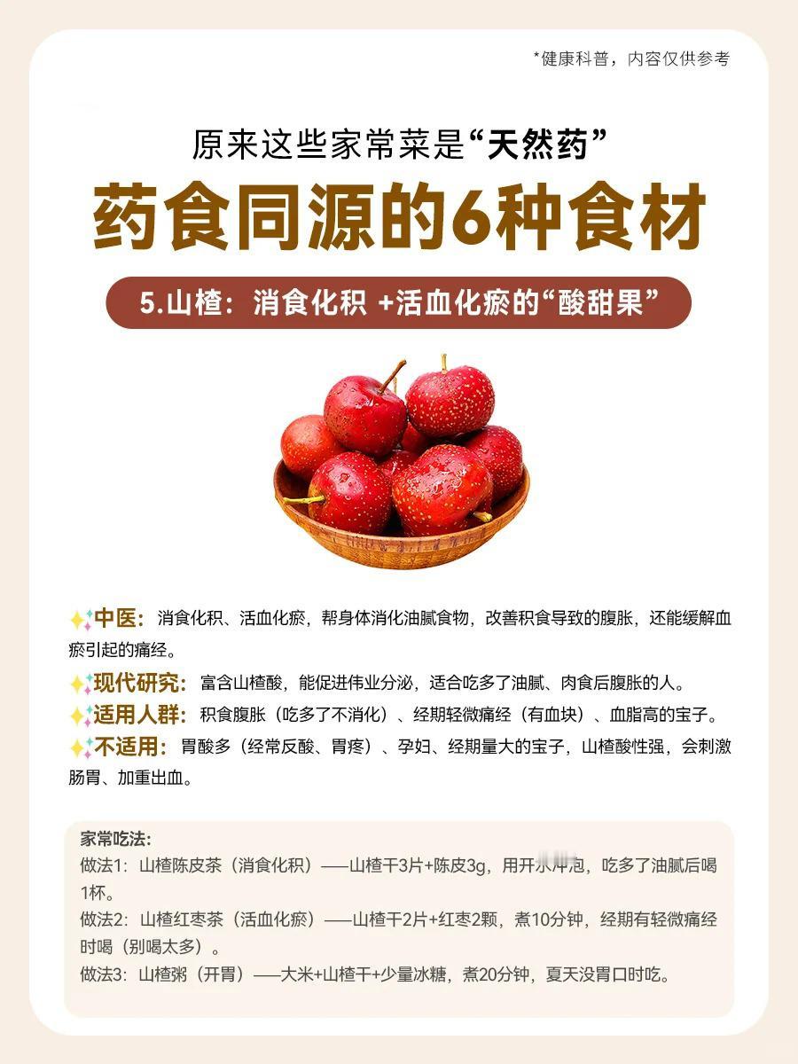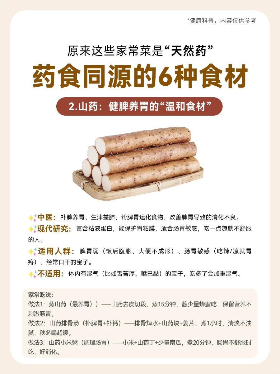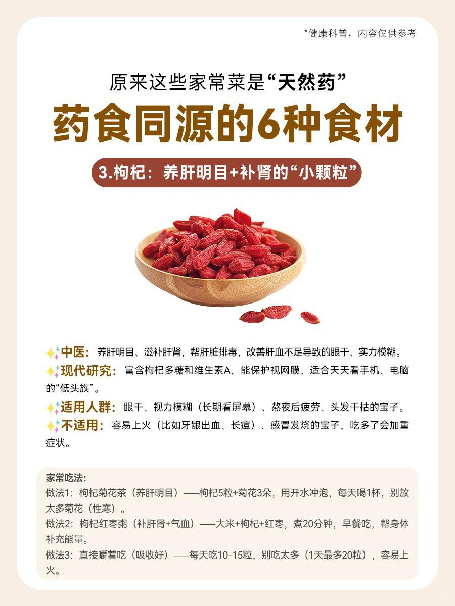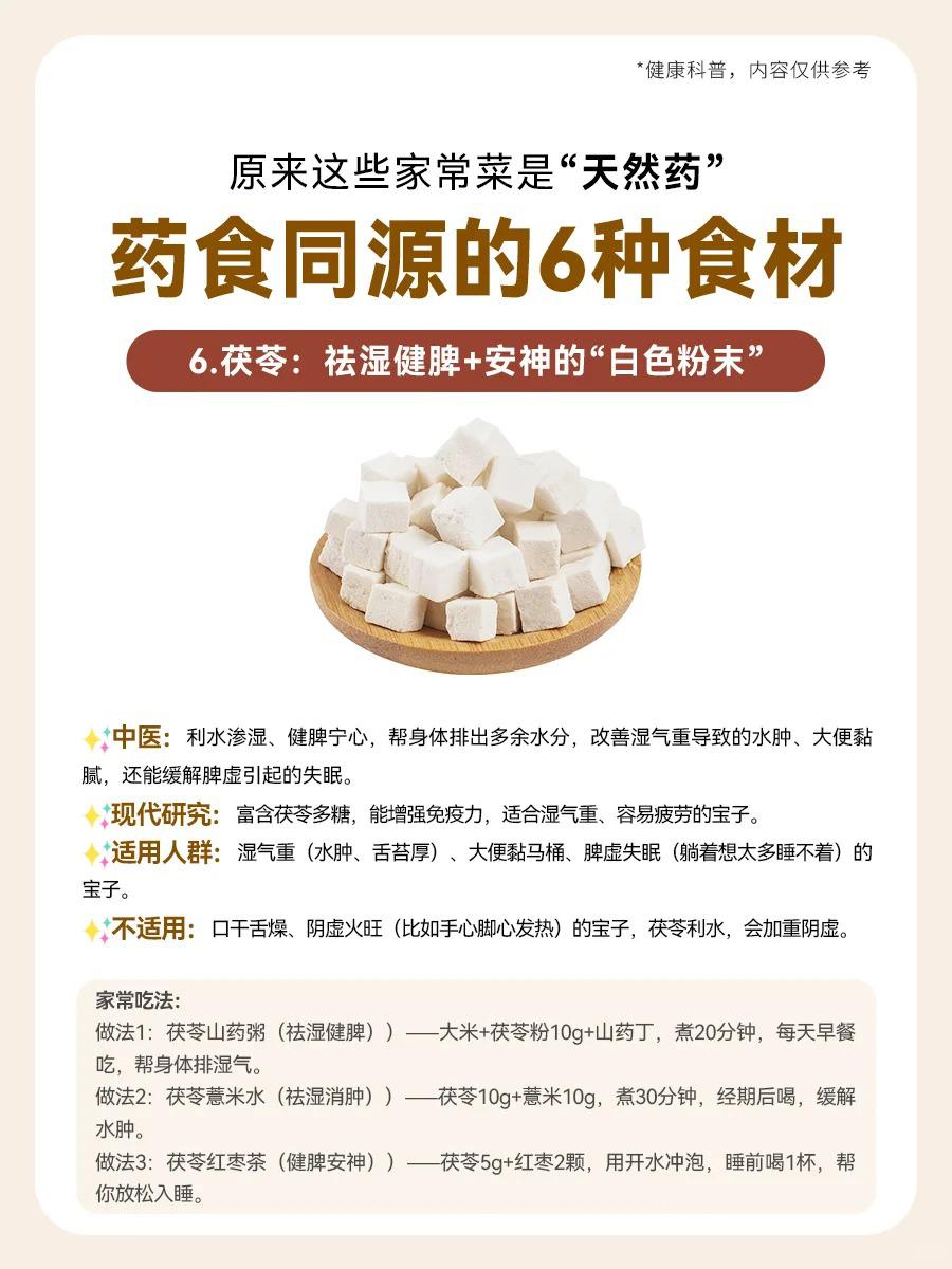 【🍲家常菜里的“天然小药箱”!6种药食同源的宝藏食材,吃出健康好体质✨】 宝子们,没想到吧?咱们餐桌上的家常菜,竟然藏着这么多“天然小药丸”!👀 今天就给大家揭秘6种药食同源的神奇食材,让你吃出健康,吃出美丽!💪 1️⃣ 红枣——补气养血的“红色瑰宝” 💡适用人群:气血虚的宝子(经期后头晕乏力)、失眠星人(翻来覆去睡不着)、脸色暗淡无光(苍白没血色)的姐妹们,红枣就是你的“天然补血剂”!💖 2️⃣ 山药——健脾养胃的“温和守护者” 💡适用人群:脾胃虚弱的宝子(饭后腹胀、大便稀软)、肠胃敏感的小伙伴(一吃辣/凉就胃痛)、经常口干的亲们,山药来帮你温柔呵护你的胃!🥣 3️⃣ 枸杞——养肝明目+补肾的“红色小精灵” 💡适用人群:眼干视力模糊的屏幕族(长期看电脑/手机)、熬夜后疲惫不堪、头发干枯毛躁的宝子,枸杞让你眼睛亮晶晶,头发乌黑亮丽!👀💇♀️ 4️⃣ 莲子——养心安神+祛湿的“安神小果子” 💡适用人群:失眠多梦易醒的宝子、压力大情绪焦虑的小伙伴、大便黏腻湿气重的亲们,莲子让你一夜好眠,身心轻松!😴🍃 5️⃣ 山楂——消食化积+活血化瘀的“酸甜小能手” 💡适用人群:积食腹胀不消化的宝子(吃多了肚子胀)、经期轻微痛经有血块的姐妹、血脂偏高的亲们,山楂帮你消化积食,活血化瘀!🍎💪 6️⃣ 茯苓——祛湿健脾+安神的“白色魔法粉” 💡适用人群:湿气重水肿的宝子(舌苔厚腻)、大便粘马桶的亲们、脾虚失眠躺床上想太多的伙伴,茯苓帮你祛湿健脾,安神助眠!🌙🍚 宝子们,这些家常菜里的“天然小药箱”,你get了吗?🥗 快来试试这些药食同源的宝藏食材,让你的身体更健康,更美丽!💖 中式养胃新风尚 健康科普小知识 食疗养生秘籍 中药养生之道 食物与健康探索 健康养生新选择