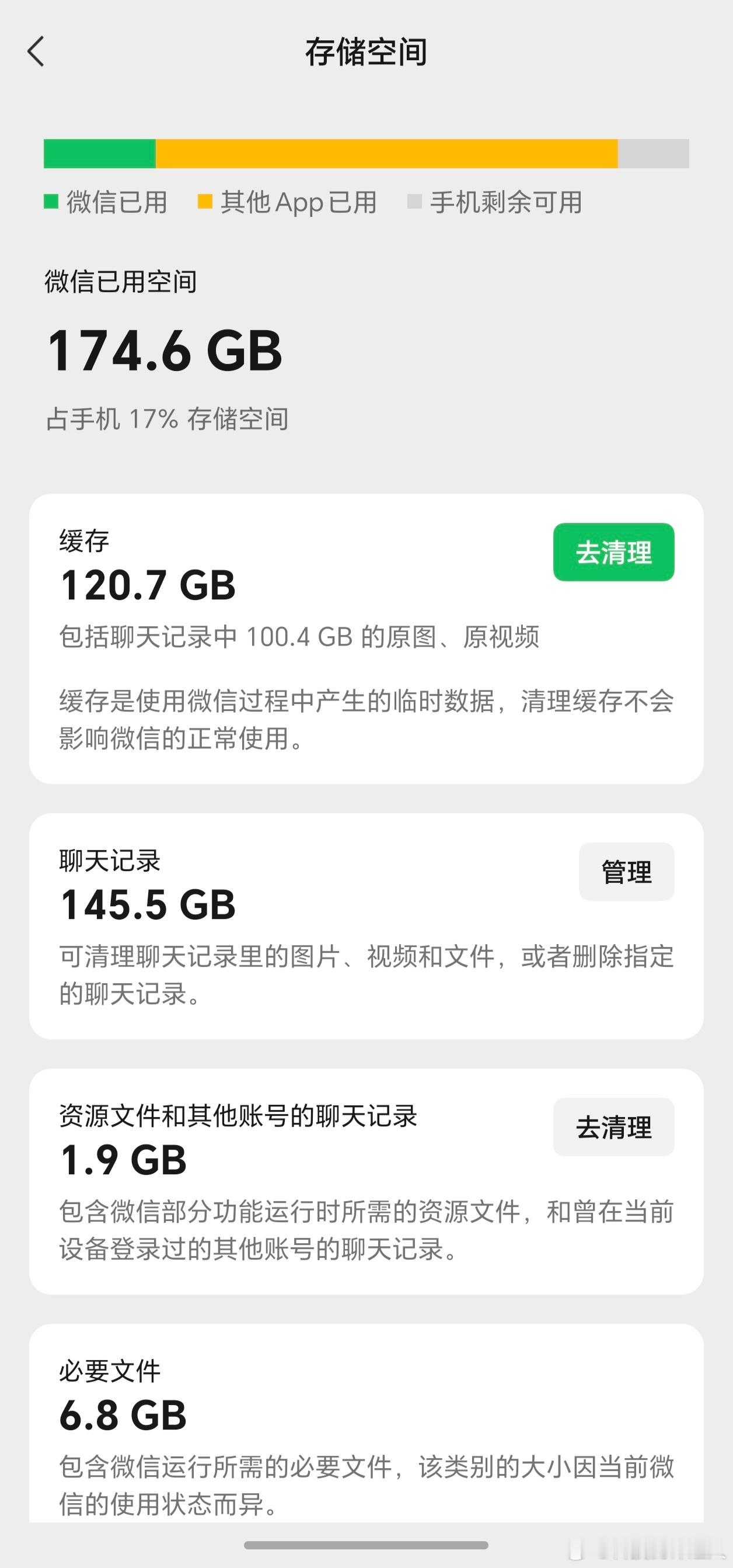 微信为什么会有几十个G看了一下我的微信存储居然占了174.6G!有点夸张了,每次换机我都会迁移聊天记录,图片和视频都不舍得删,虽然以后大概率也不会去看,但是找信息还是方便的,买手机还是得大内存,现在1TB内存还剩下109G的空间,再用个一年我估计1TB都不够了
