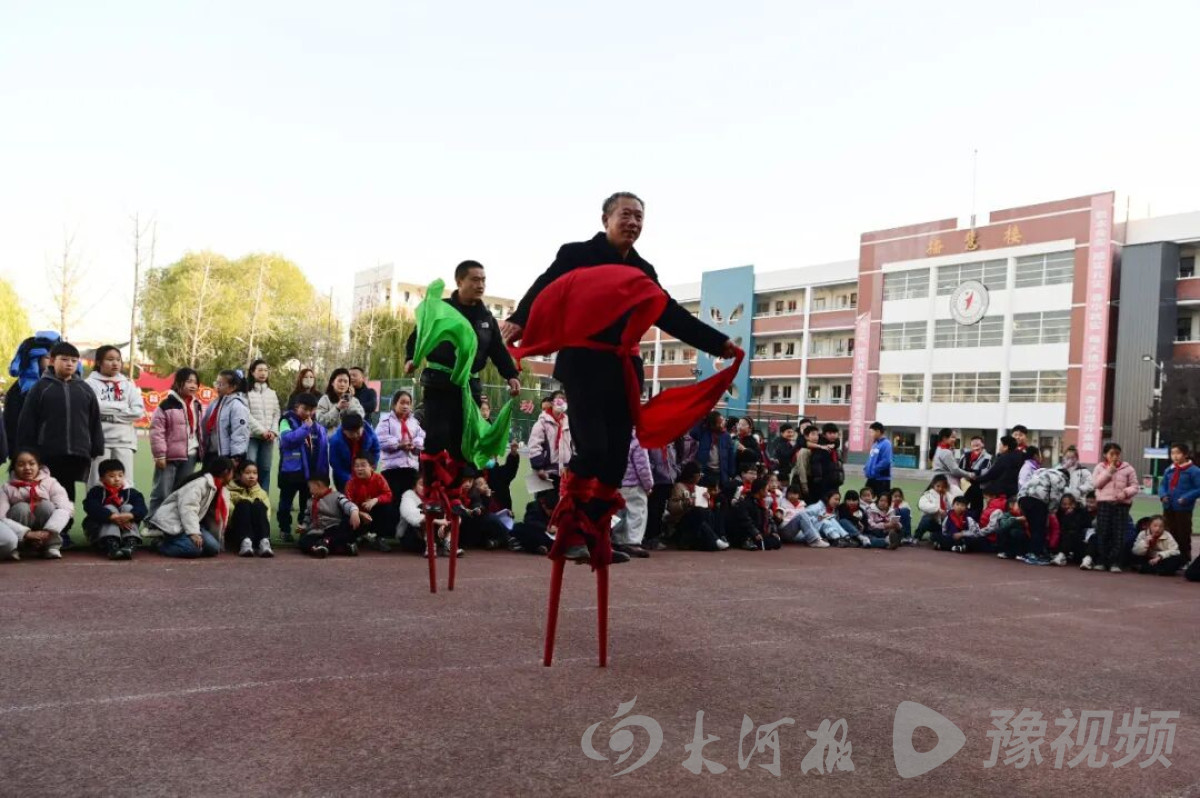 沁阳市山王庄镇万南村国家级非物质文化遗产项目高跷(高抬火轿)代表性传承人卫平均(右)等艺人为沁阳市实验小学学生表演“踩高跷”。杨帆摄