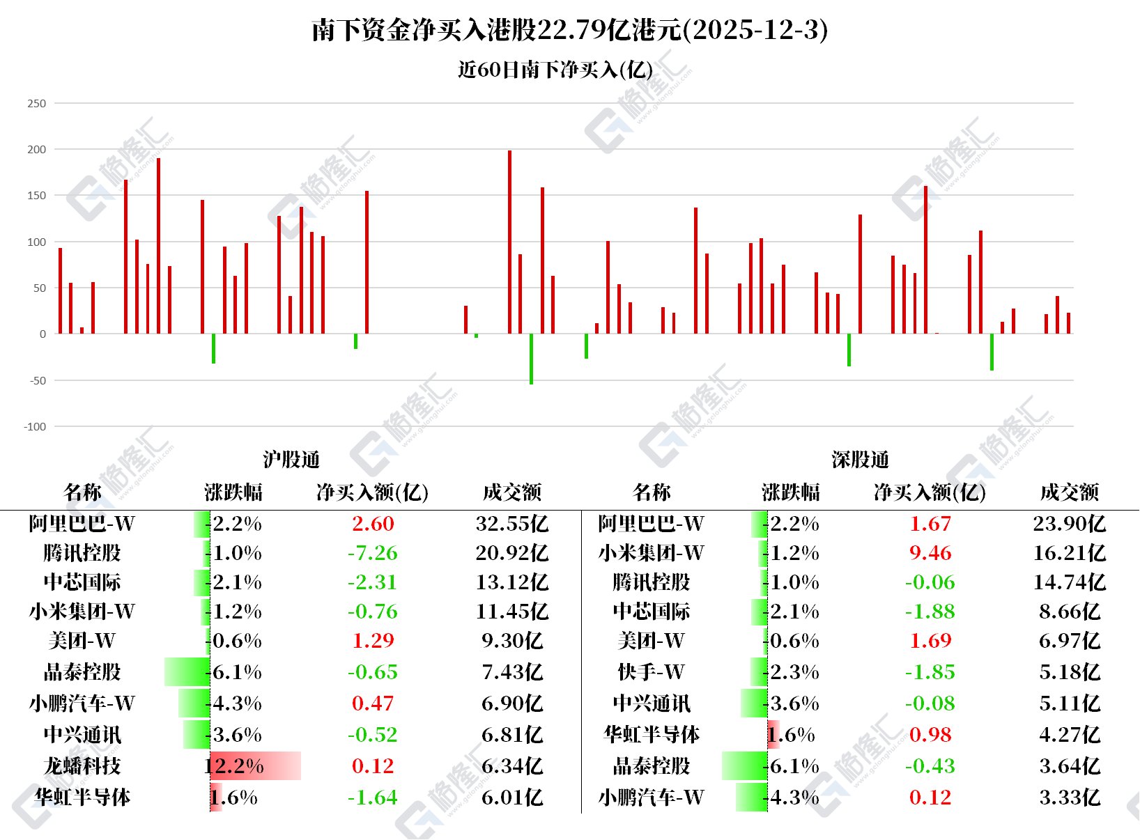 格隆汇12月3日|南下资金今日净买入港股22.79亿港元。其中:净买入小米集团-W8.7亿、阿里巴巴-W4.27亿、美团-W2.97亿;净卖出腾讯控股7.32亿、中芯国际4.19亿、快手-W1.85亿、晶泰控股1.07亿。