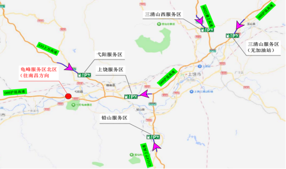服务区:过往司乘人员可进入G60沪昆高速梨温段三清山服务区(无加油站)、G0321德上高速三清山西服务区、G1514宁上高速铅山服务区、G60沪昆高速上饶服务区、S33上万高速弋阳服务区,提前做好加油、充电、休息及车辆检修等。