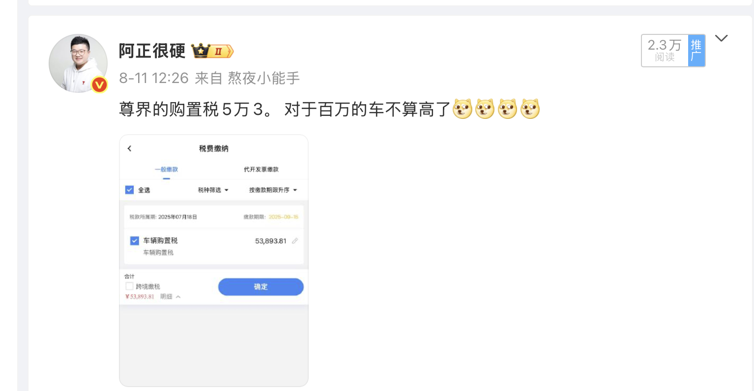尊界购置税补贴延期,相当于年前订车,明年提车还能省1.5万最高。