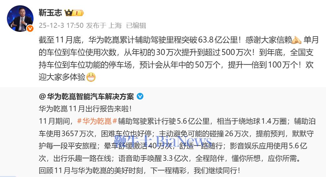 华为智能汽车解决方案BUCEO靳玉志转发微博并表示:截至11月底,华为乾崑累计辅助驾驶里程突破63.8亿公里!感谢大家信赖单月的车位到车位使用次数,从年初的30万次提升到超过500万次!