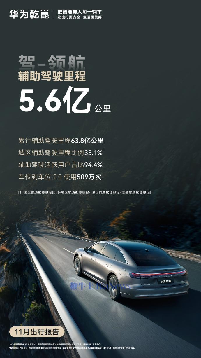 本月华为乾崑辅助驾驶累计行驶5.6亿公里,累计63.8亿公里。其中,城区辅助驾驶里程比例35.1%,辅助驾驶活跃用户占比94.4%,车位到车位2.0使用509万次。
