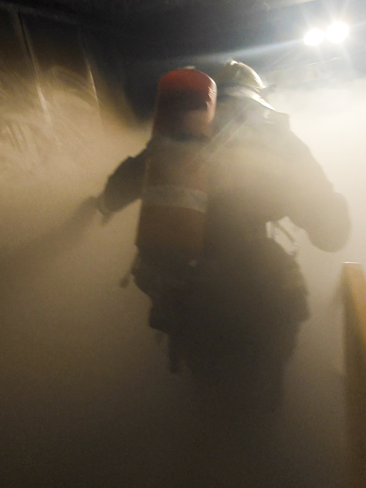 在模拟的火场中,由于我前方是消防安全员,起初感觉还是很踏实,但进入火场没多久,由于消防员专业的救援经验,在安全员稳步往前的情况下,后面的模拟人员显得比较笨拙,不时会有人掉队。