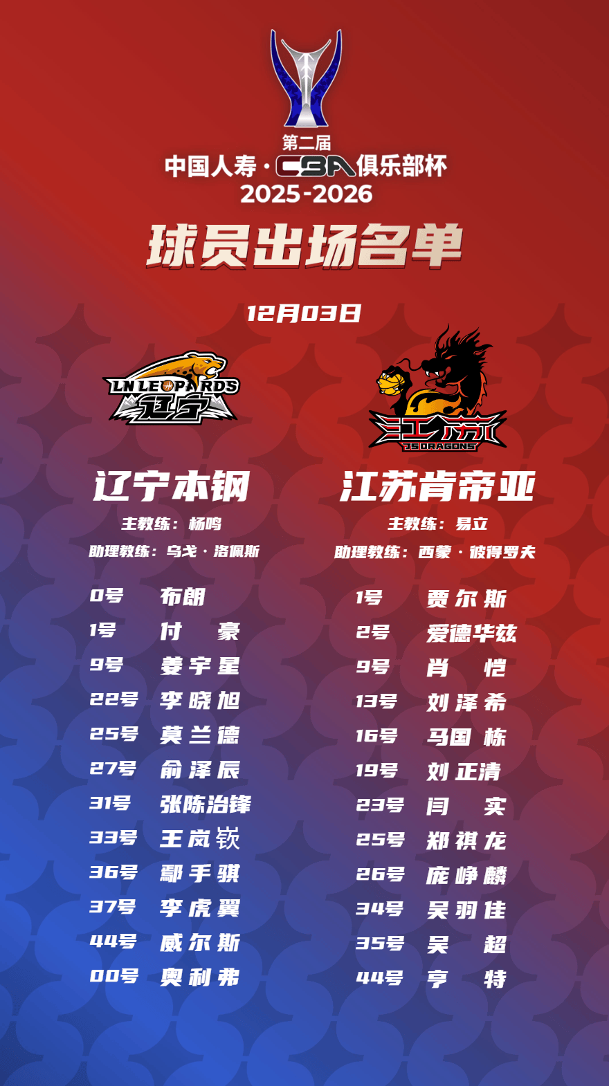 虎扑12月03日讯今日CBA俱乐部杯,辽宁男篮对阵江苏男篮。