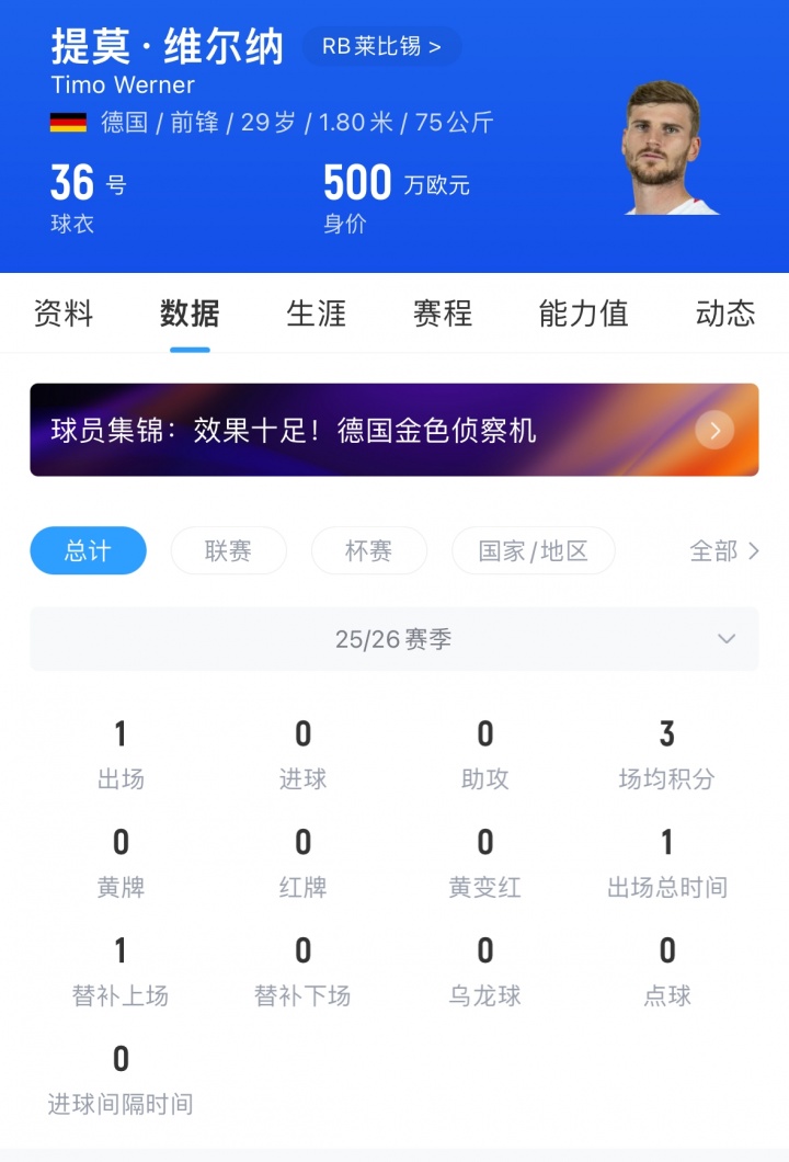 维尔纳现年29岁,他与莱比锡的合同2026年到期,现身价500万欧。