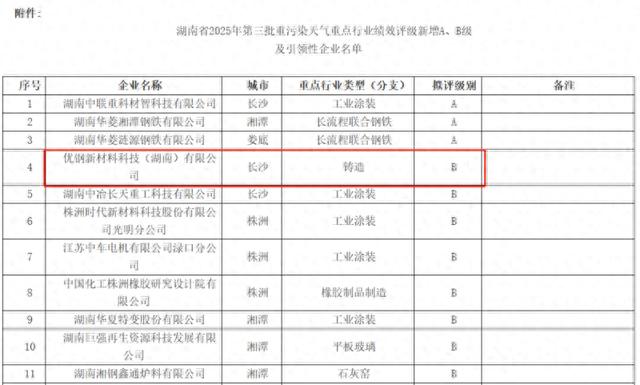 长沙晚报掌上长沙12月3日讯(全媒体记者张禹通讯员许颂坚刘梓琦)近日,湖南省生态环境厅公示全省2025年第三批重点行业绩效评级新增A、B级及引领性企业名单,落户宁乡经开区的优钢新材料科技(湖南)有限公司(简称“优钢新材”)成功获评B级企业,成为长沙市黑色金属铸造行业中首家取得该评级的企业。