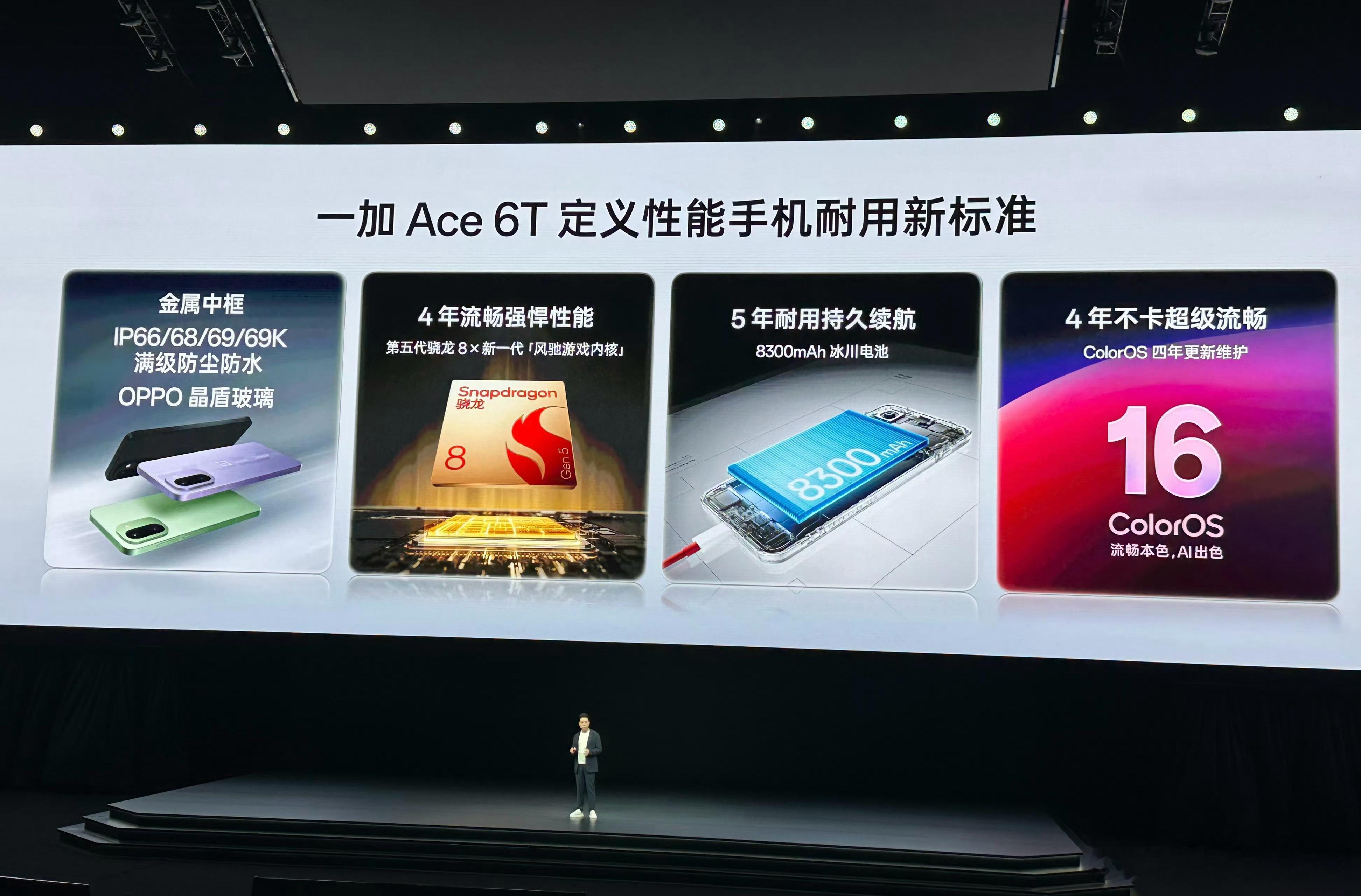 一加Ace6T新品发布一加Ace6T周边配置给的都还是挺满的,支持IP66/68/69/69K满级防水 + 3D超声波指纹 + OPPO晶盾玻璃,8300mAh电池 + 100W快充,应该是同档最大了,6.83英寸165Hz纯直屏,后置5000万主摄(索尼IMX906) + 800万超广角双摄,这电池容量没毛病了吧