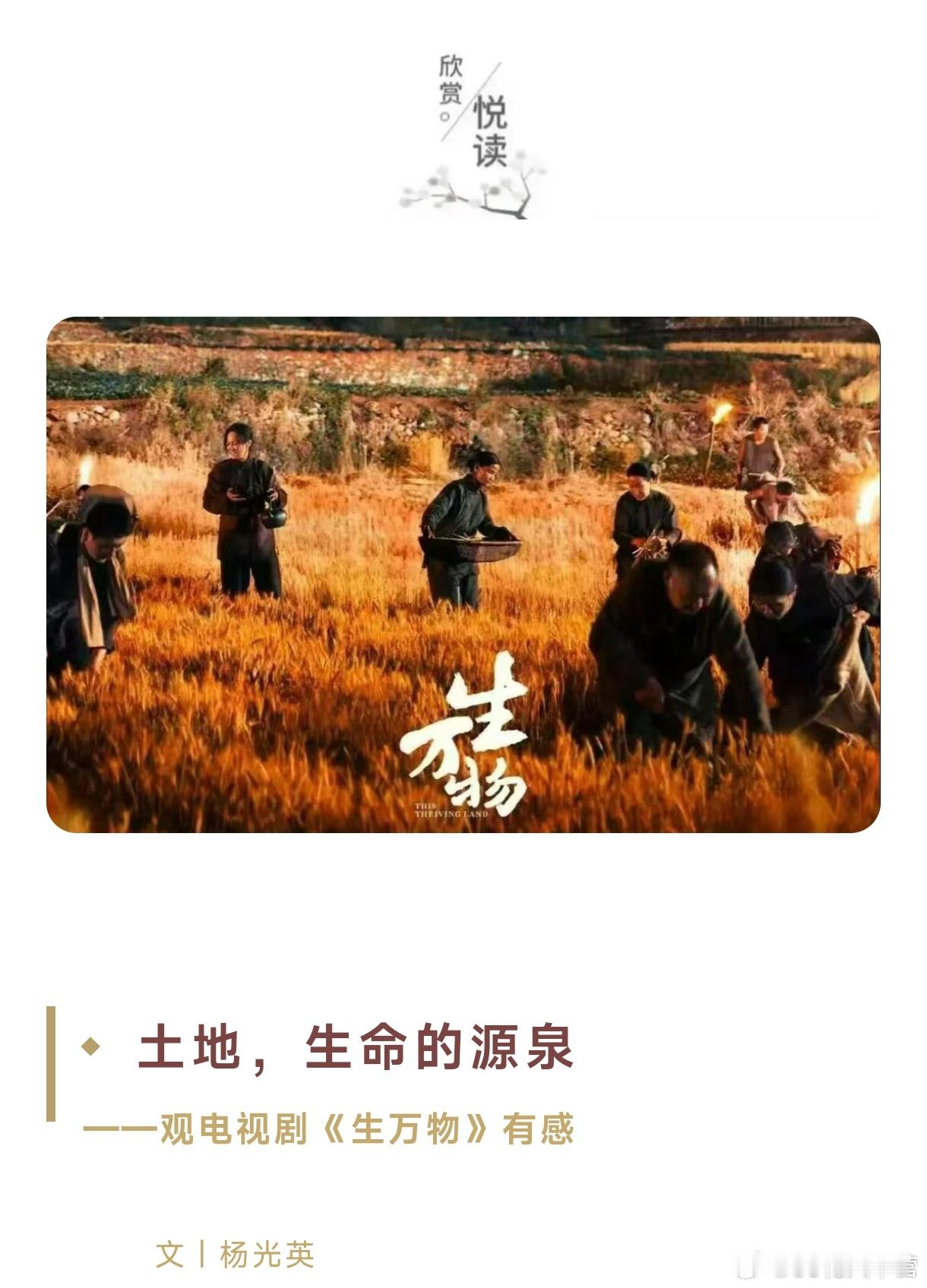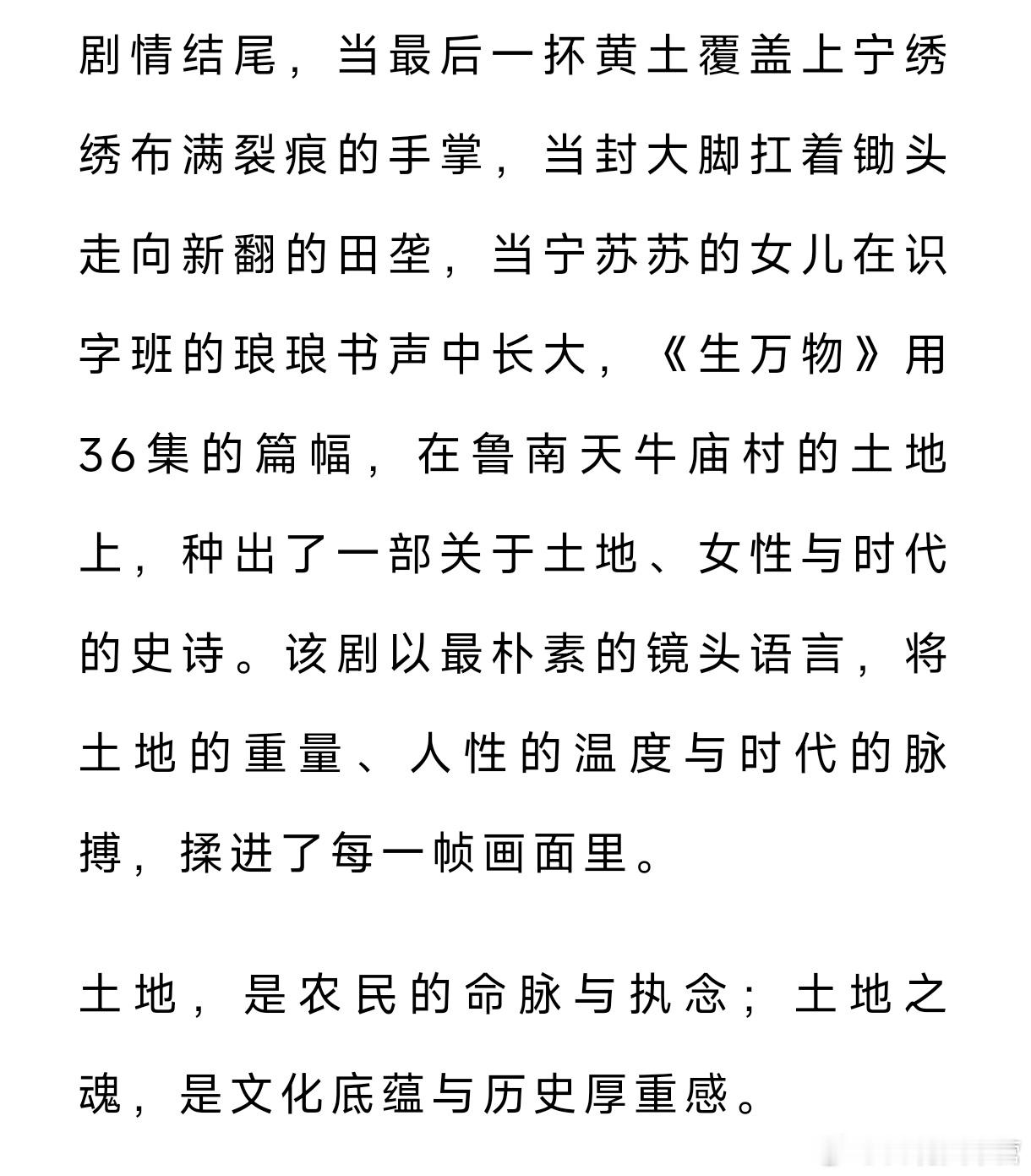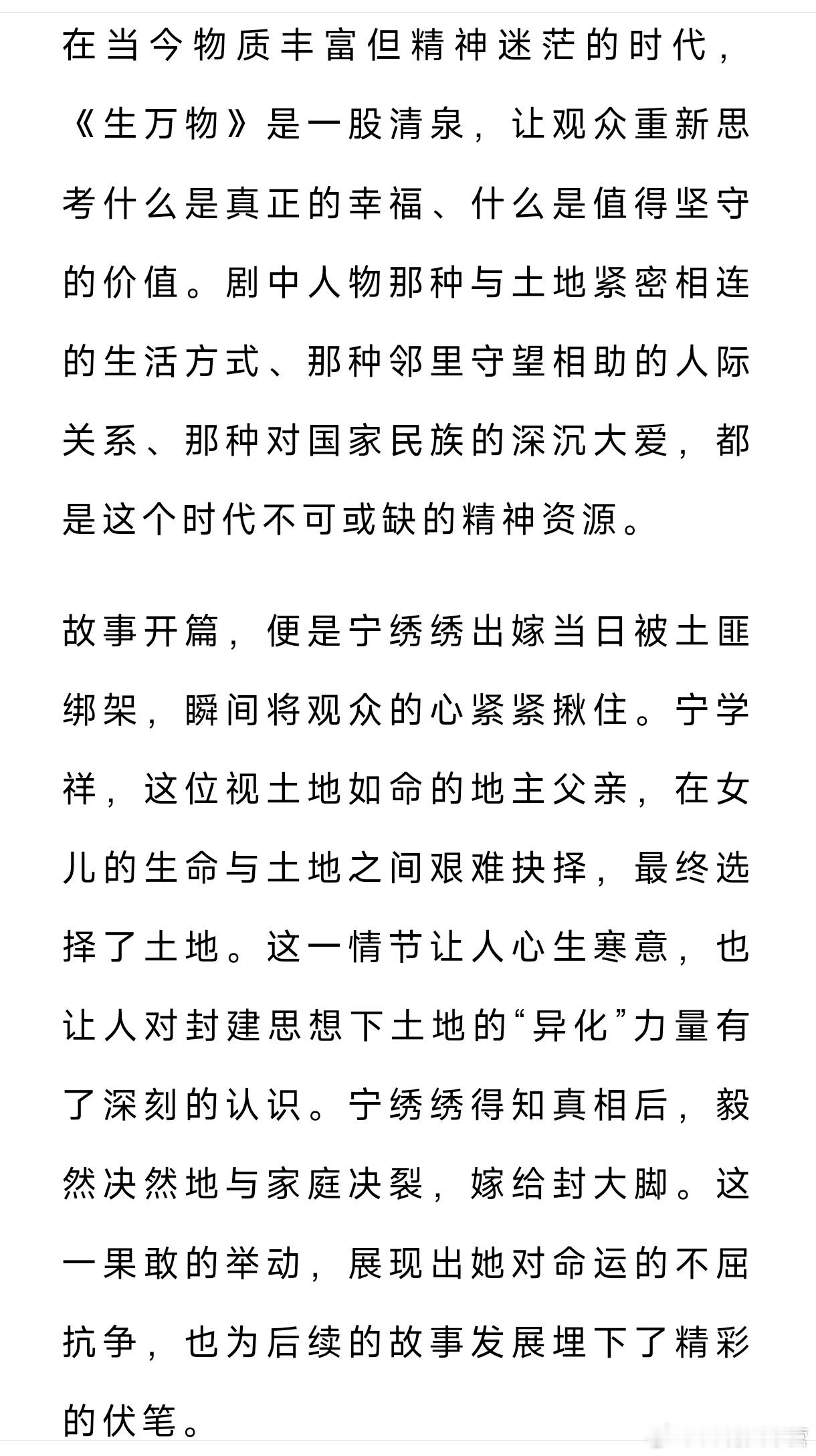 《四川散文》刊登——土地,生命的源泉——观电视剧《生万物》有感在当今物质丰富但精神迷茫的时代,《生万物》是一股清泉,让观众重新思考什么是真正的幸福、什么是值得坚守的价值。剧中人物那种与土地紧密相连的生活方式、那种邻里守望相助的人际关系、那种对国家民族的深沉大爱,都是这个时代不可或缺的精神资源。宁绣绣,从一个养尊处优的地主家小姐,被迫走进田间地头。在生活的磨砺中,她逐渐理解了土地对于农民的意义,更难能可贵的是,她没有被命运打倒,而是积极学习农业知识,帮助邻里改良种植技术,带领妇女们冲破封建思想的牢笼。她就像黑暗中的一盏明灯,不仅照亮了自己前行的道路,也为身边的人带来了希望与力量 。(好剧,大剧,爆剧的待遇生万物杨幂生万物