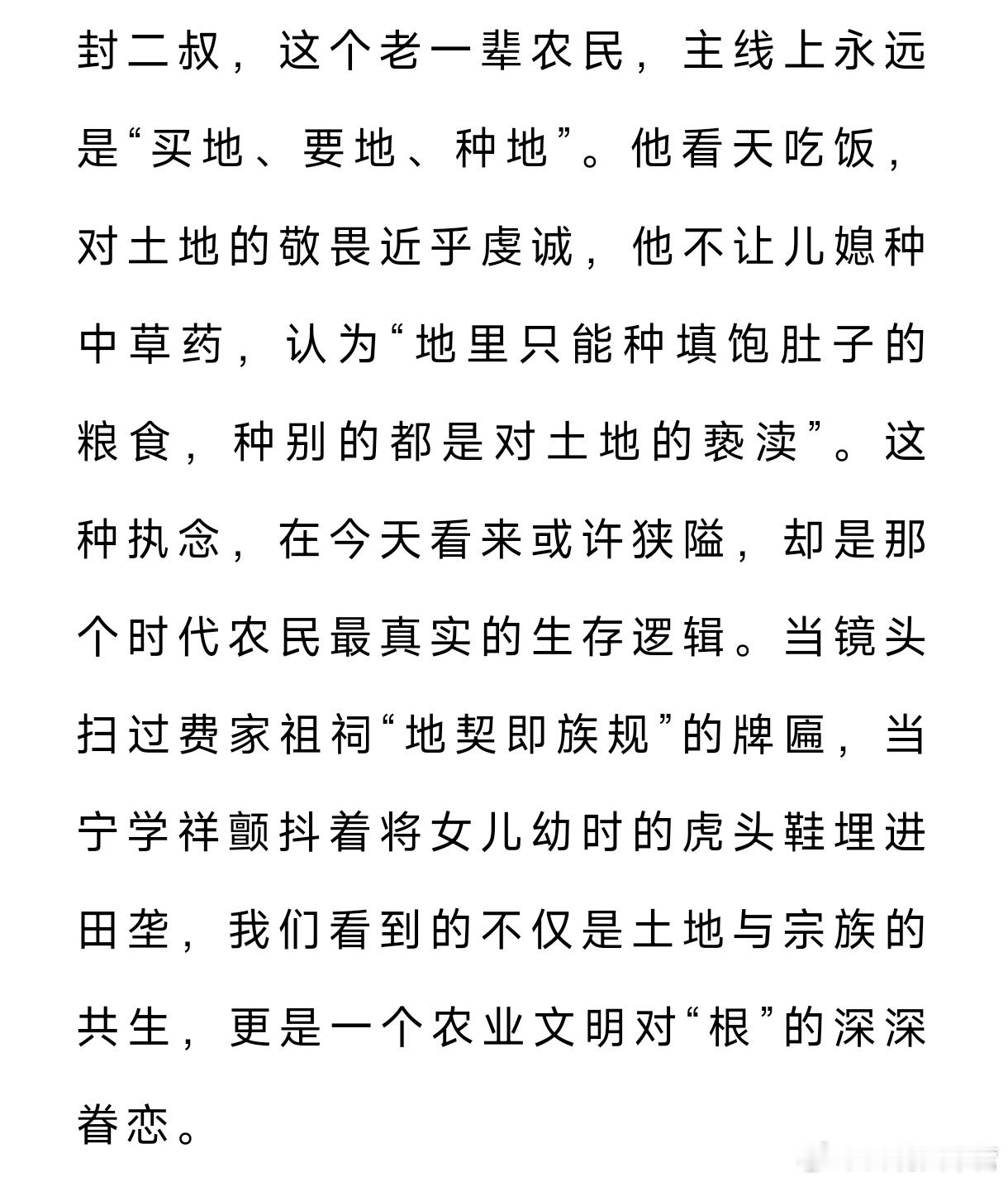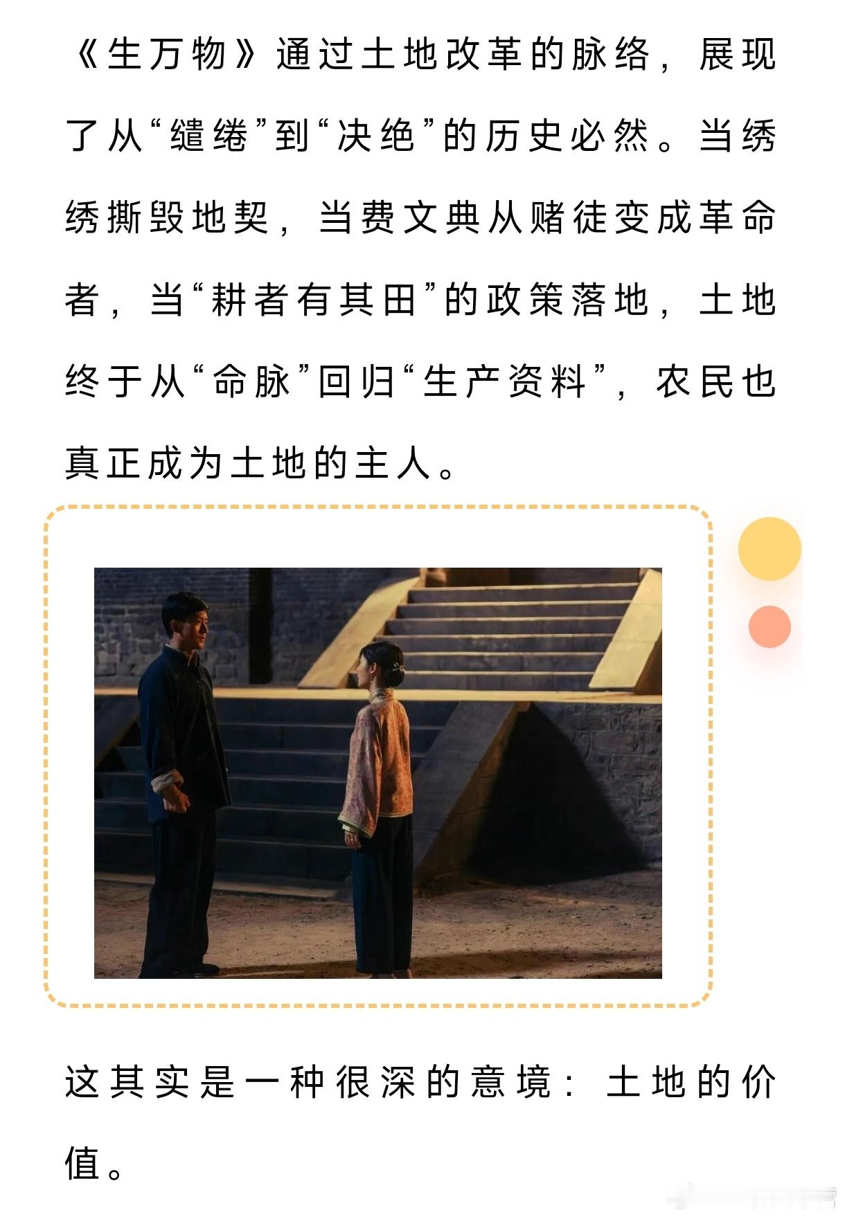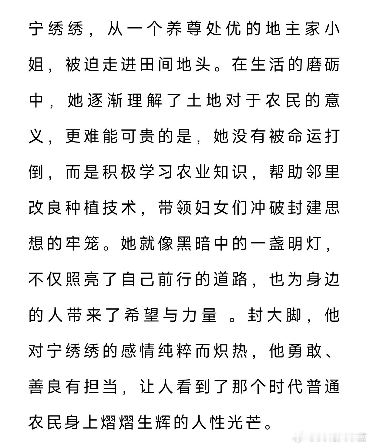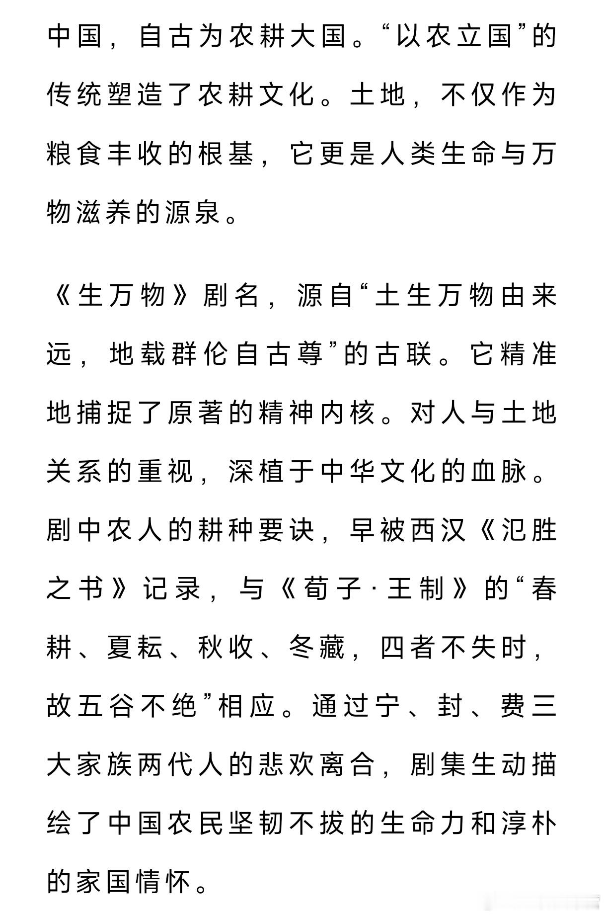 《四川散文》刊登——土地,生命的源泉——观电视剧《生万物》有感在当今物质丰富但精神迷茫的时代,《生万物》是一股清泉,让观众重新思考什么是真正的幸福、什么是值得坚守的价值。剧中人物那种与土地紧密相连的生活方式、那种邻里守望相助的人际关系、那种对国家民族的深沉大爱,都是这个时代不可或缺的精神资源。宁绣绣,从一个养尊处优的地主家小姐,被迫走进田间地头。在生活的磨砺中,她逐渐理解了土地对于农民的意义,更难能可贵的是,她没有被命运打倒,而是积极学习农业知识,帮助邻里改良种植技术,带领妇女们冲破封建思想的牢笼。她就像黑暗中的一盏明灯,不仅照亮了自己前行的道路,也为身边的人带来了希望与力量 。(好剧,大剧,爆剧的待遇生万物杨幂生万物