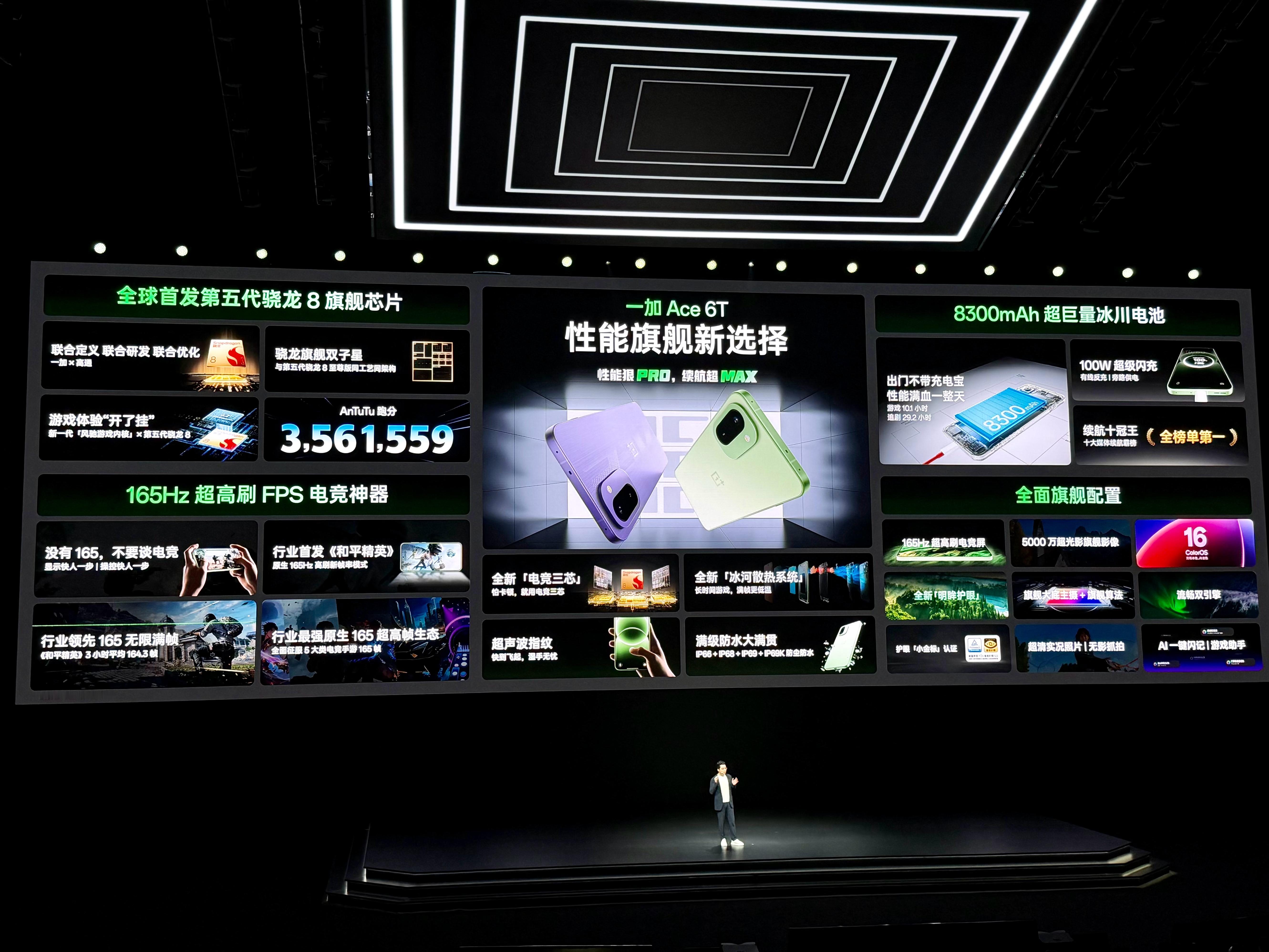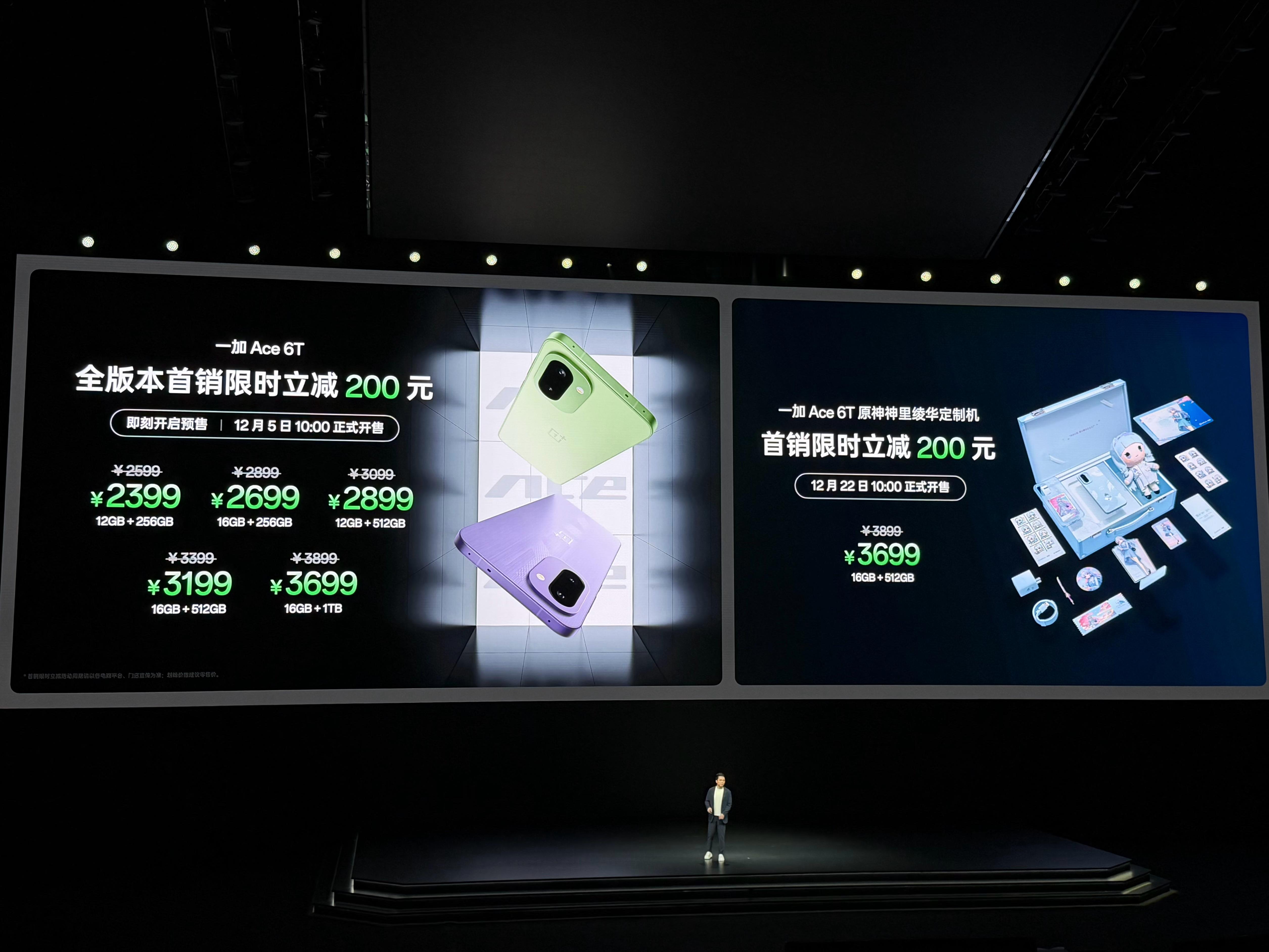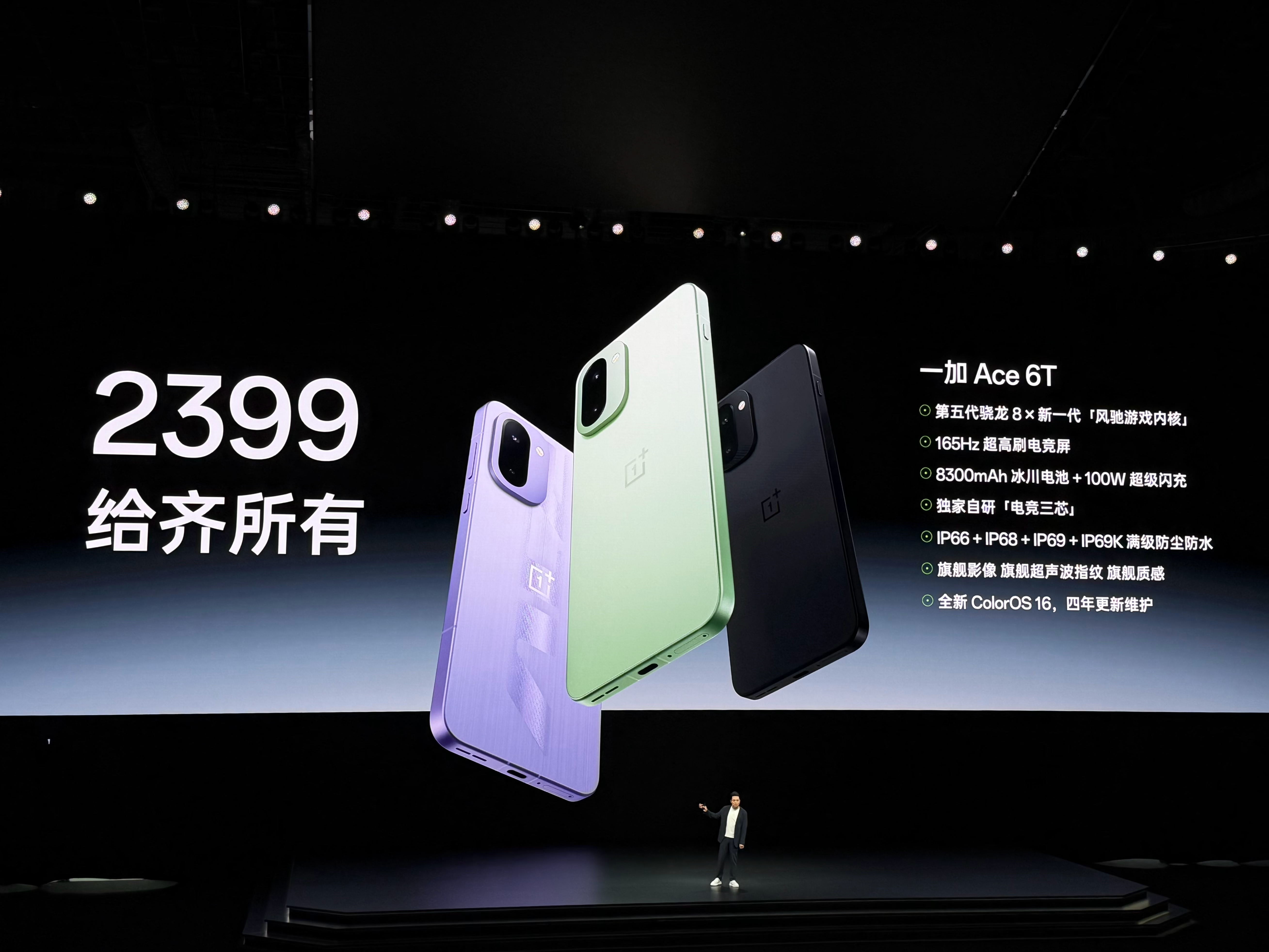 一加Ace6T正式发布,到手价2399元!性能狠Pro,续航超Max!以满配旗舰实力重塑性能手机新标杆。三款潮流配色搭配金属魔方Deco与黄金R角设计,兼顾旗舰质感与舒适握持,超窄边大屏更带来沉浸式视觉体验。全球首发联合研发的第五代骁龙8芯片、独家新一代风驰游戏内核,配合LPDDR5X Ultra+UFS 4.1性能铁三角,安兔兔跑分高达356万!重载游戏、4K剪辑全程流畅。165Hz无限满帧加持,搭配行业唯一电竞三芯解决方案,实现性能、网络、触控三重不卡顿,团战稳帧、操控跟手,竞技优势拉满。8300mAh超巨量冰川电池+100W闪充,续航登顶权威榜单,出门告别充电宝;IP66/68/69/69K防尘防水大满贯与超耐磨晶盾玻璃,四年流畅五年耐用。超光影旗舰影像、旗舰超声波指纹等全维配置拉满,还有原神神里绫华定制机,12月22日上线,性能旗舰新选择,闭眼冲就对了!你用过165Hz手机打游戏吗 杭州·萧山区瓜沥文体中心体育馆