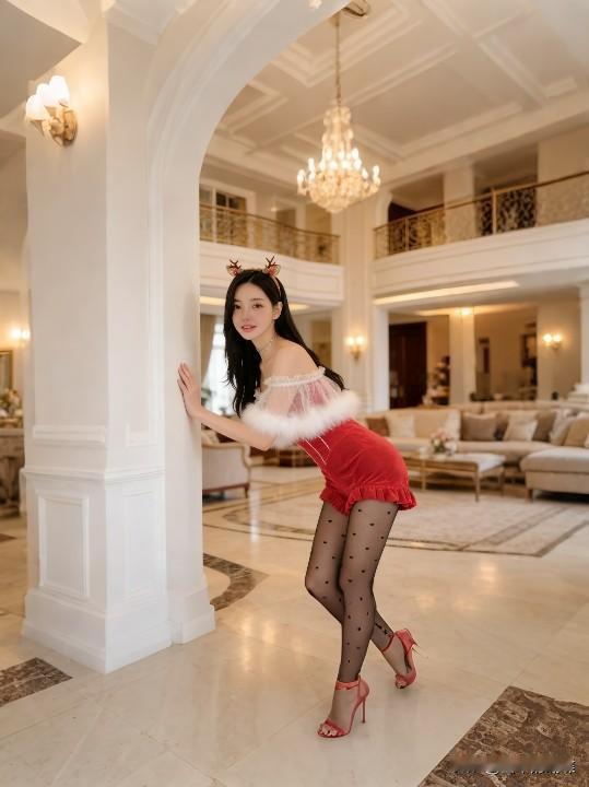 优雅圣诞红裙,甜美鹿角发饰,冬日里的温暖时光。